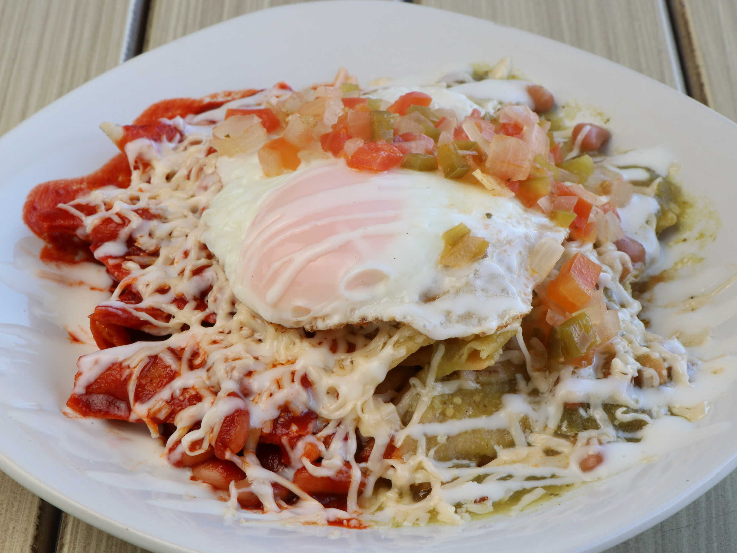 Chilaquiles verdes y rojos con huevo estrellado y pico de gallo.