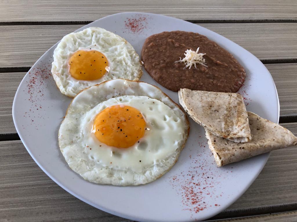2 Huevitos estrellados acompañados de chilaquiles verde natural una deshebrada y frijolitos.