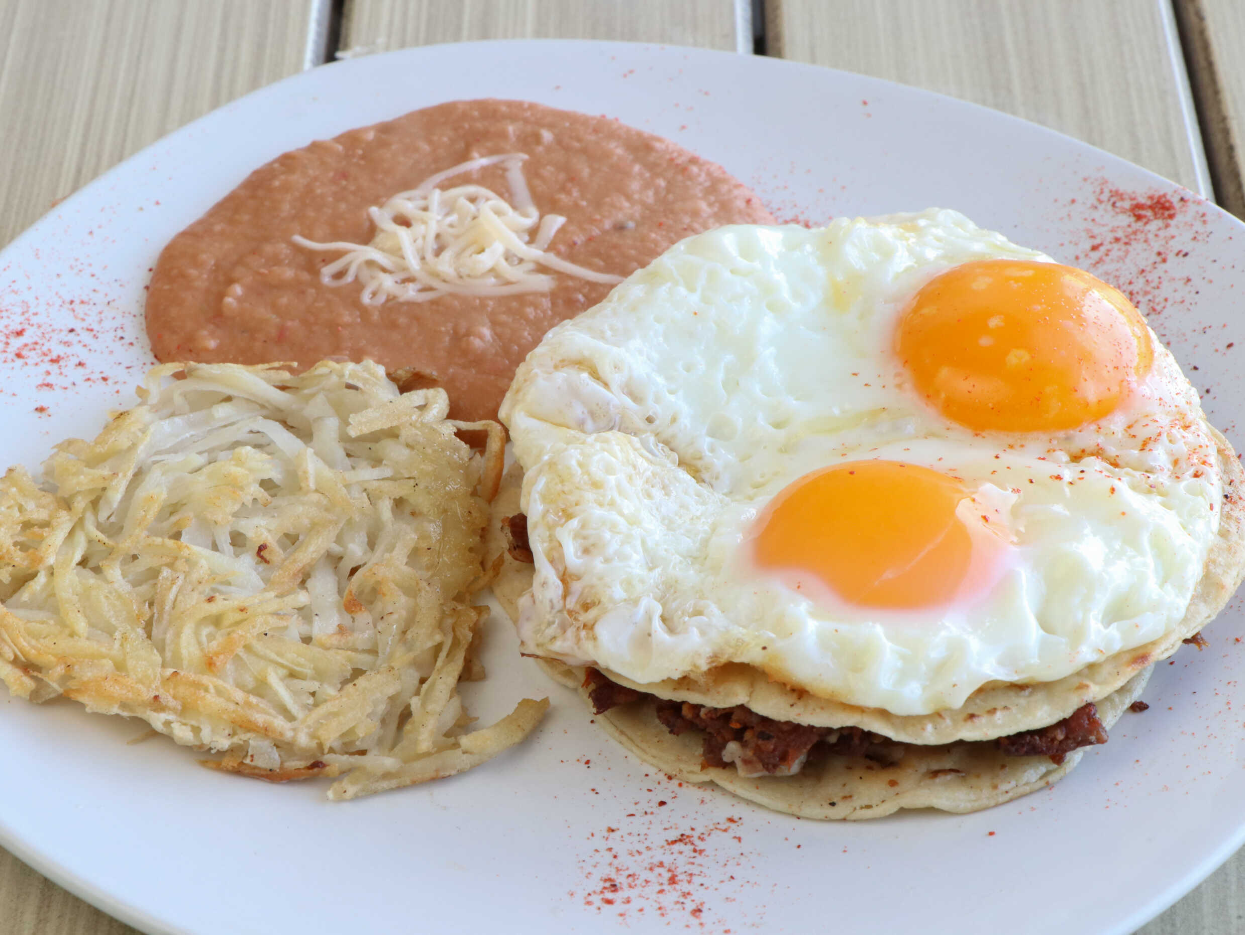Quesadilla frita de chicharrón bajo huevos estrellados.