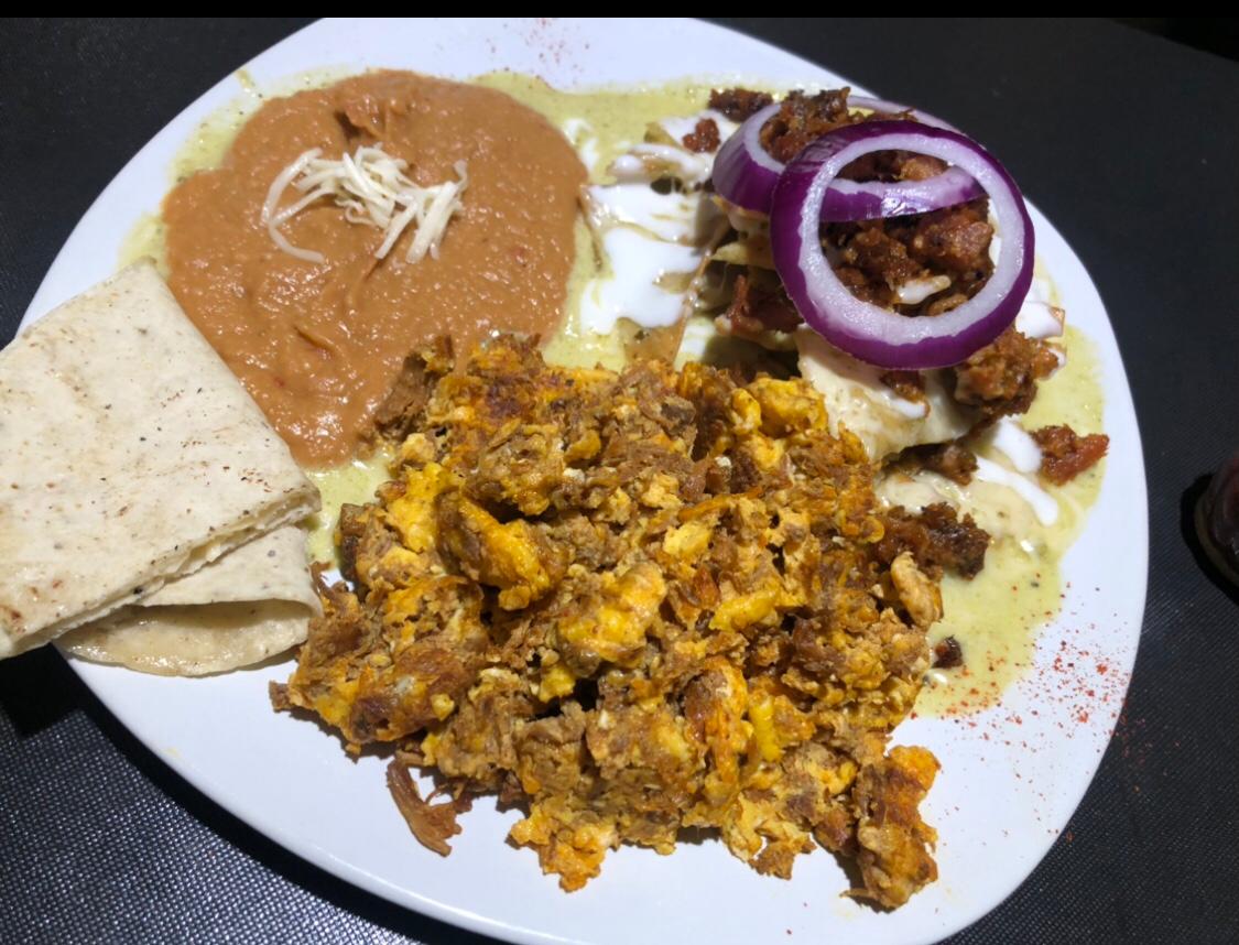 Huevo revuelto con chilorio, acompañado de chilaquiles poblano, con chicharrón y frijolitos.
