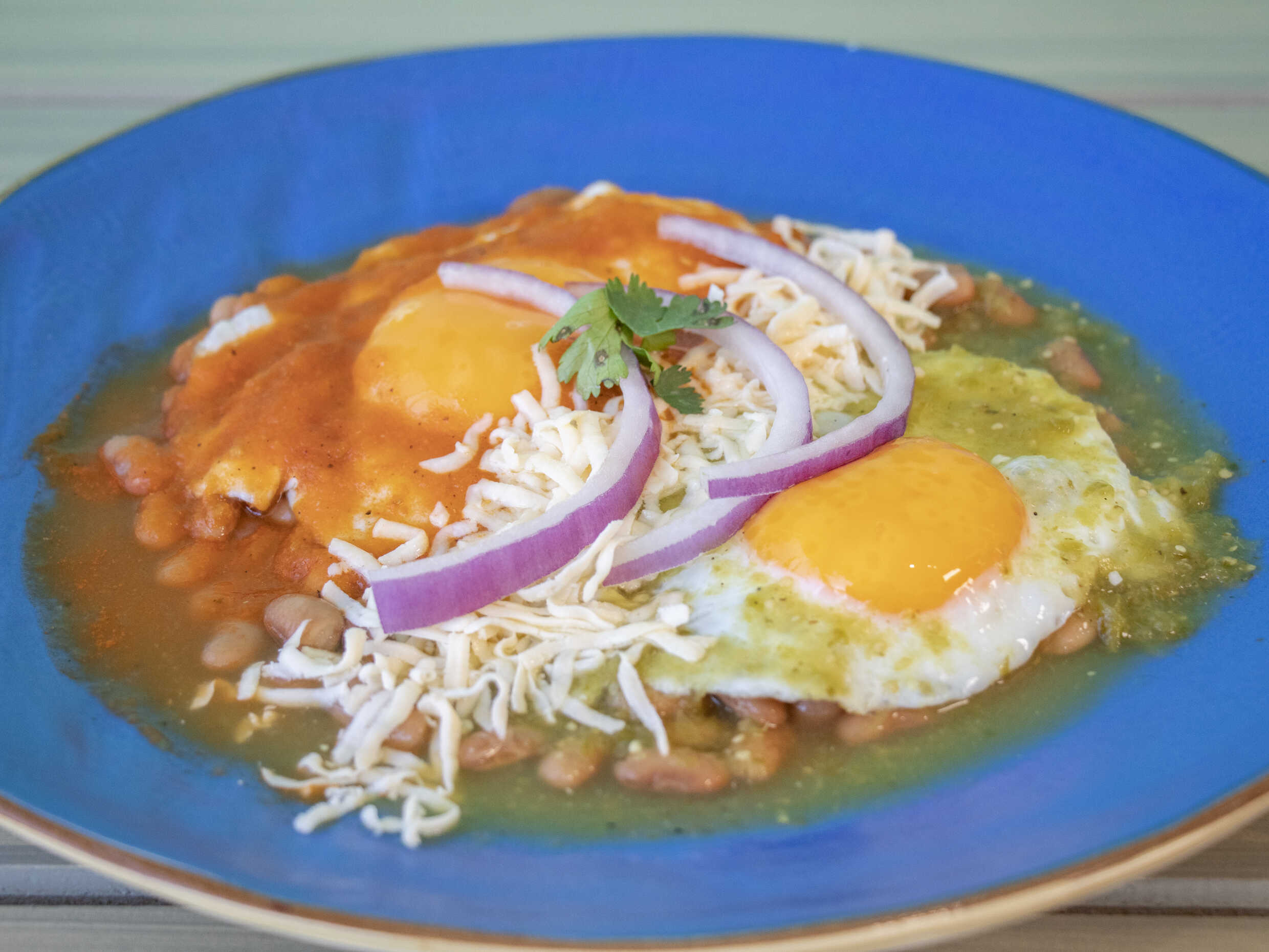 Estrellados sobre frijolitos de la olla, separados por salsa roja y verde.