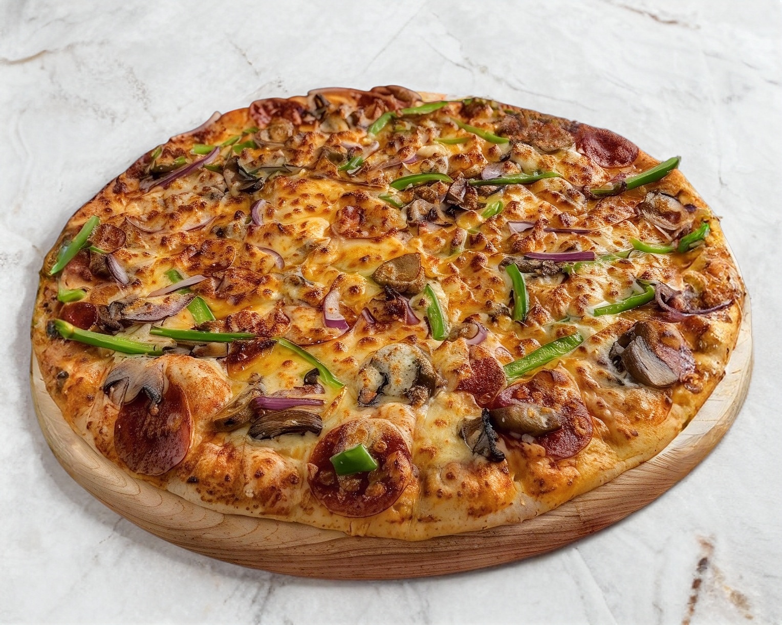 rica pizza de pepperoni cebolla morada champiñon morron verde