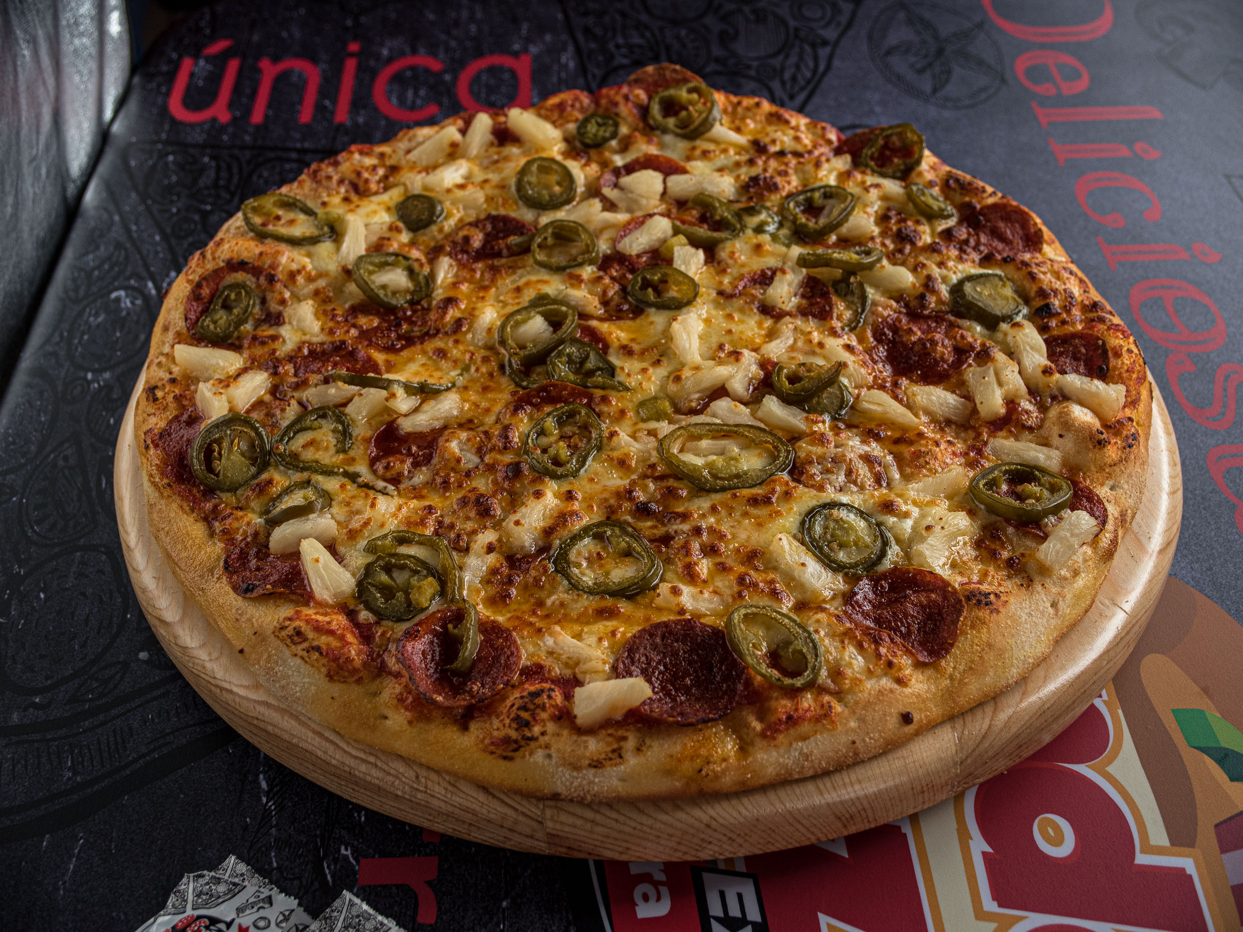 Rica pizza con pepperoni, jamon, champiñón y chorizo