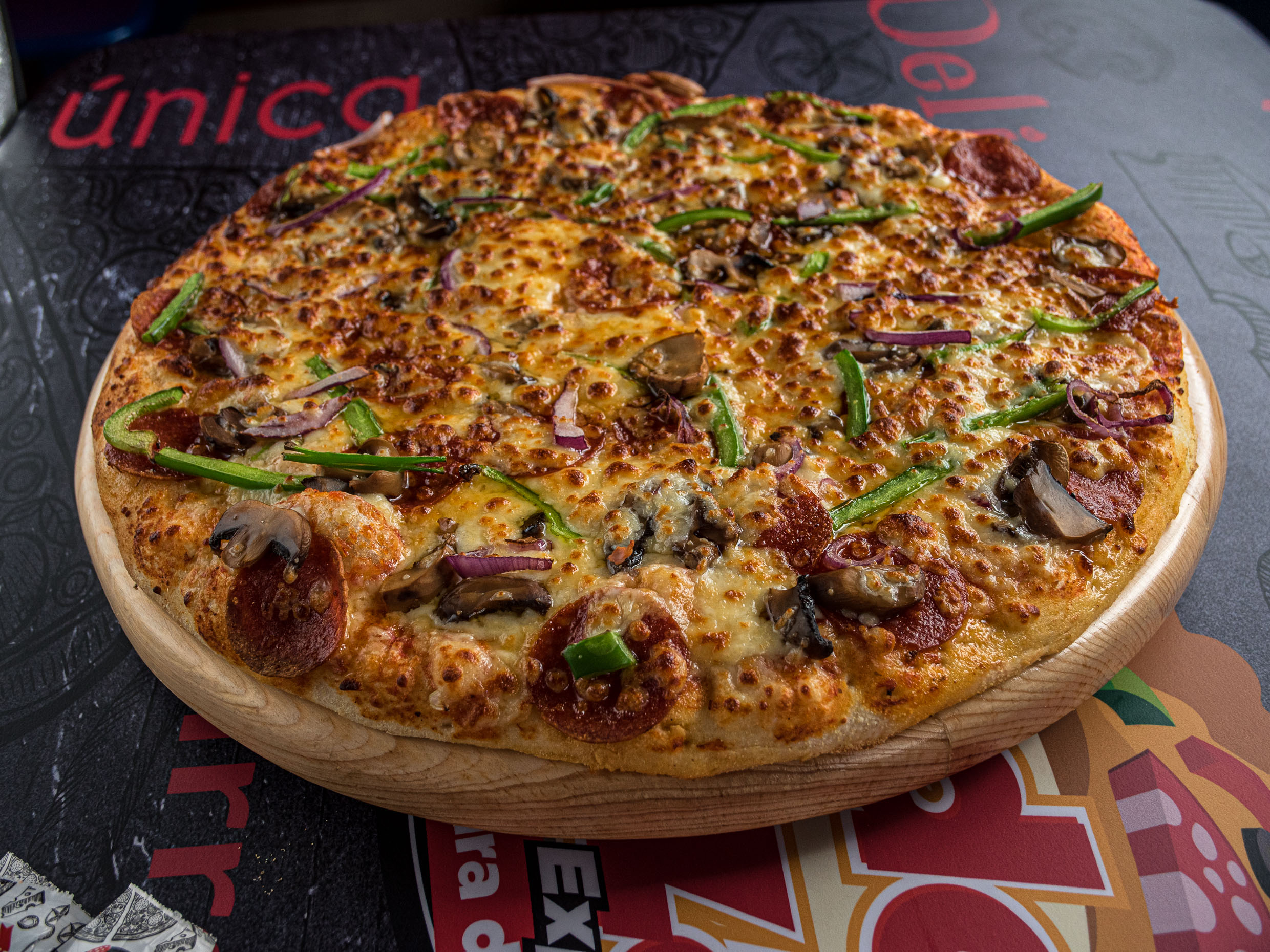 Rica pizza con pepperoni, champiñón, pimiento y cebolla