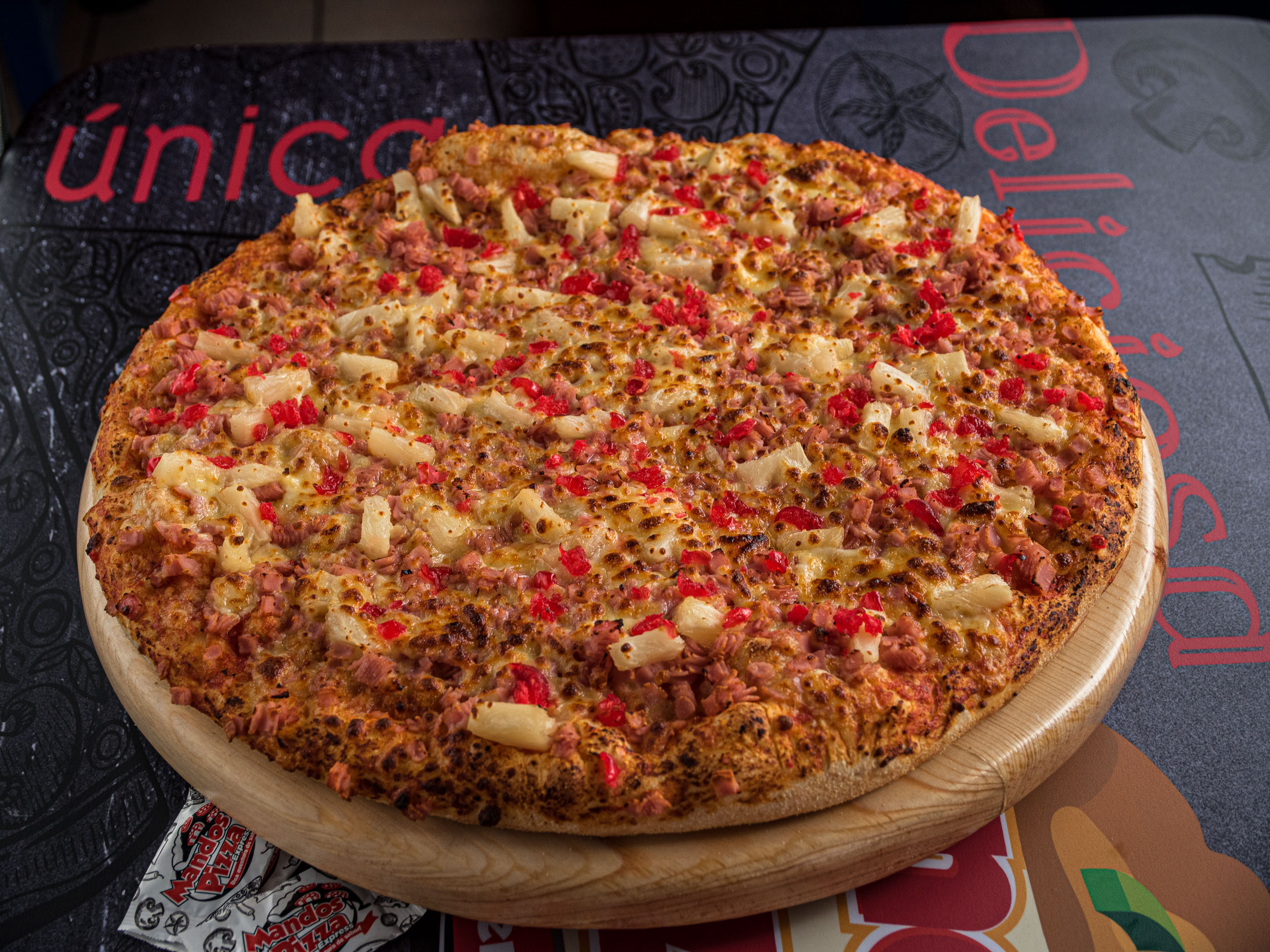 Rica pizza con Jamon, piña y cereza