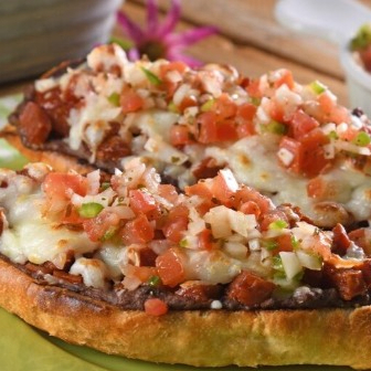 Crujientes panes con base de frijoles refritos y queso gratinado, doraditos al horno.