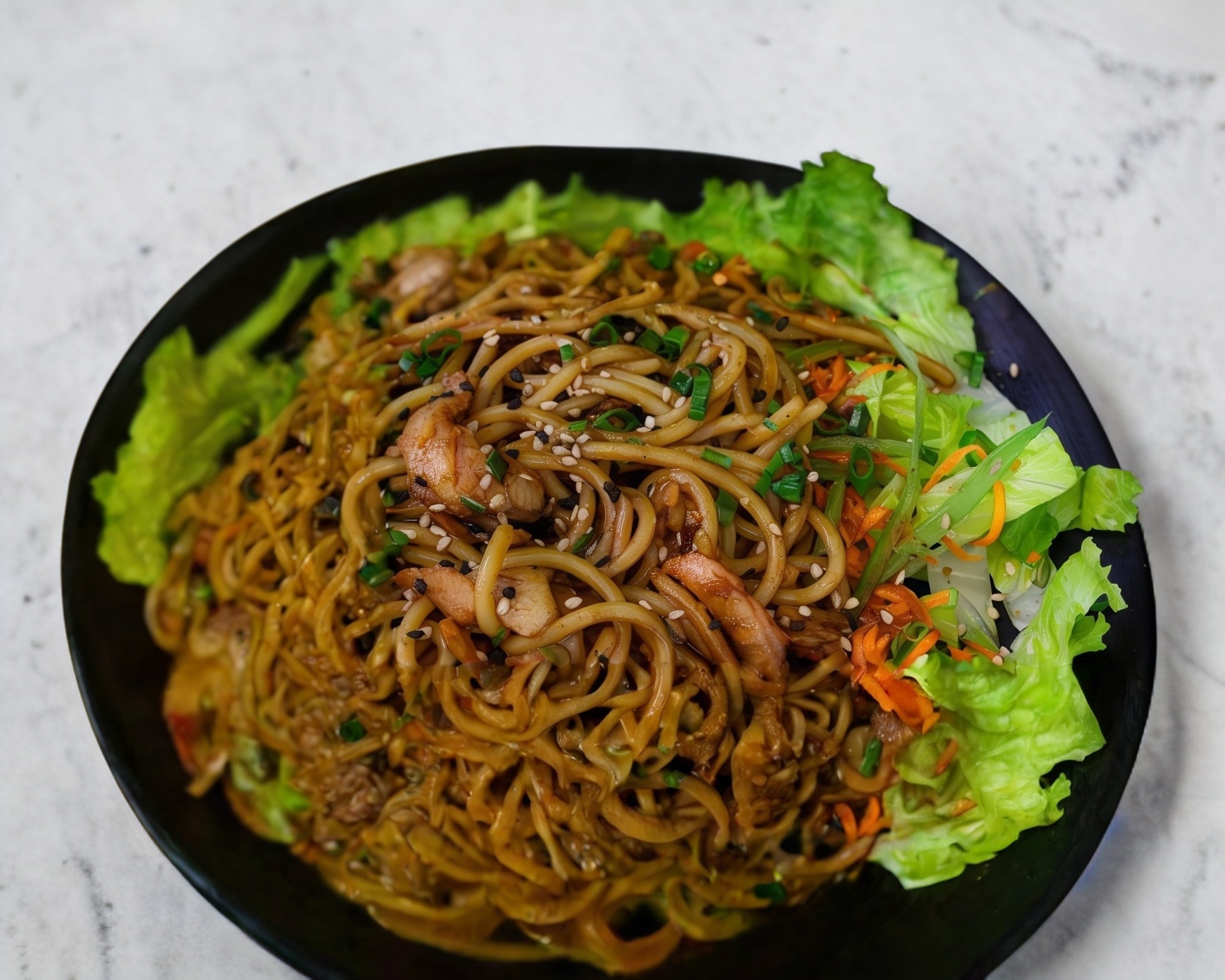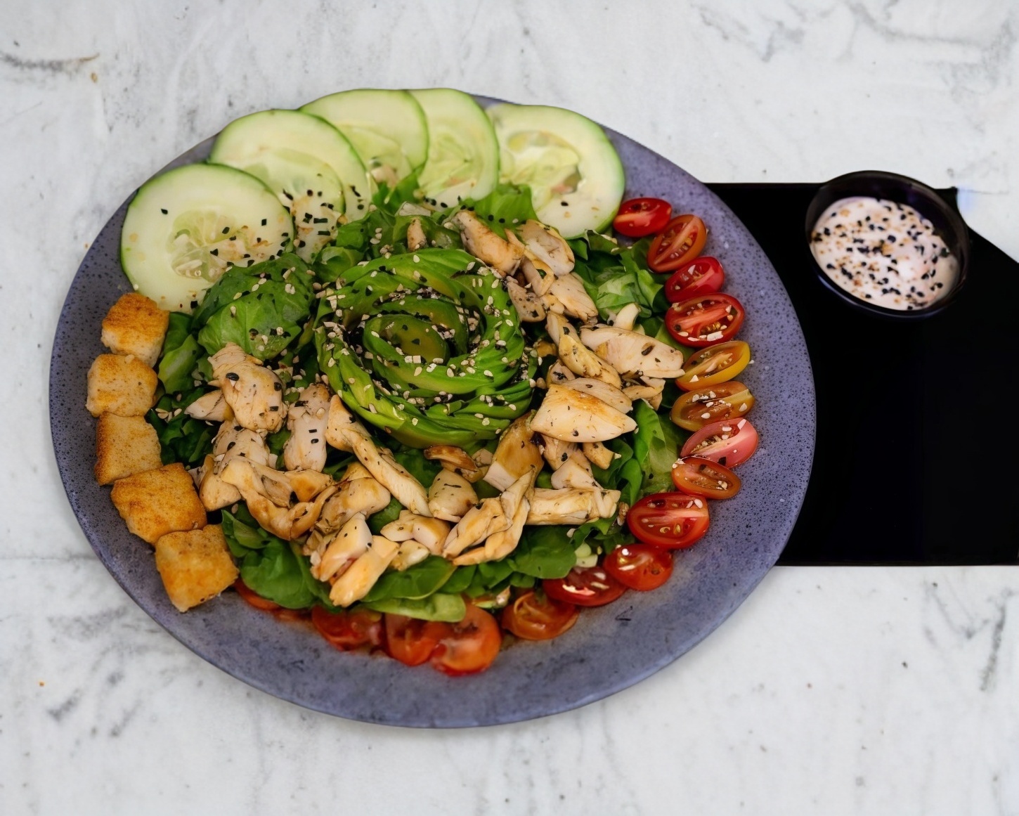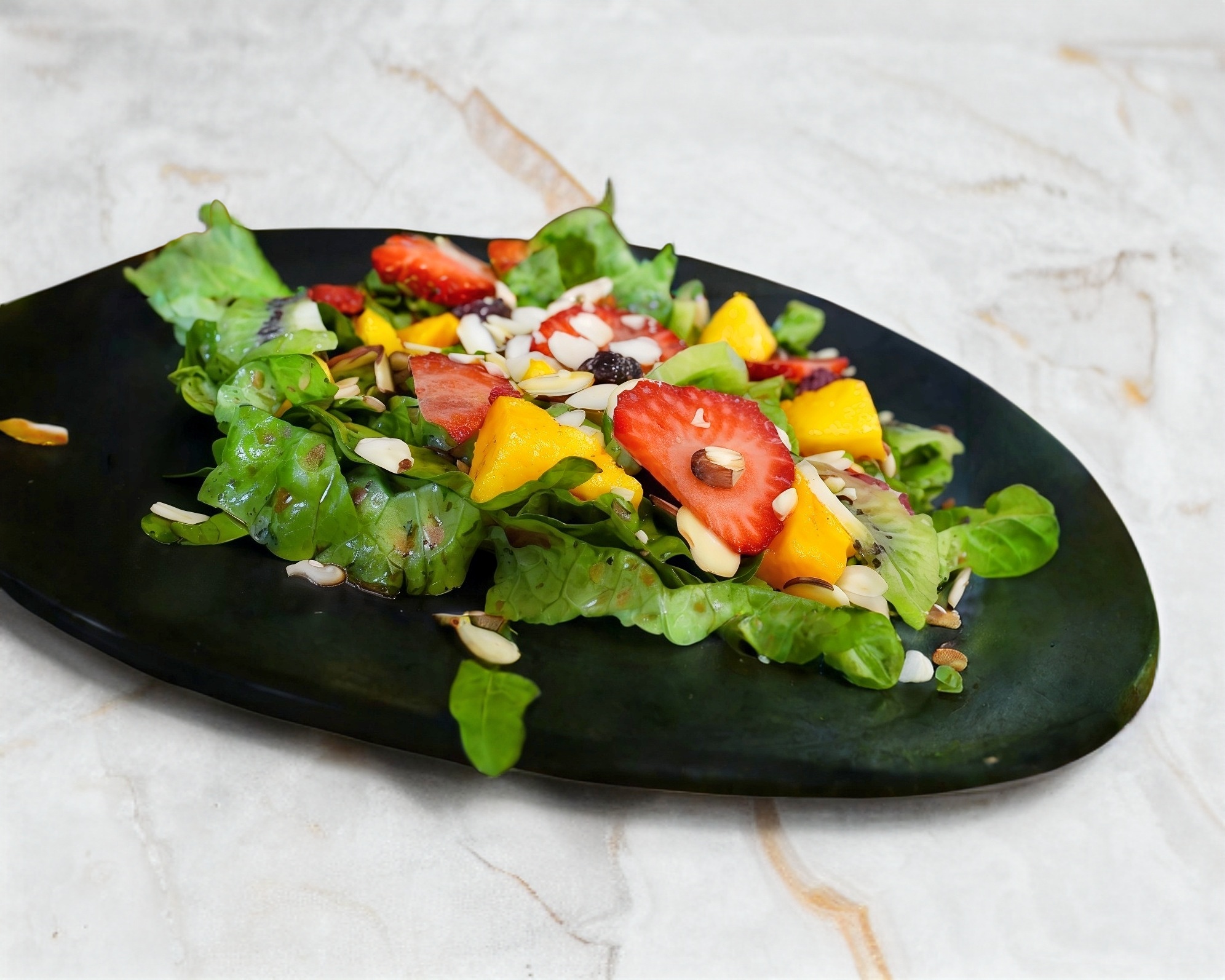 Espinaca baby y lechuga con tiras de pollo empanizado con nuez, almendra y vinagre balsamico