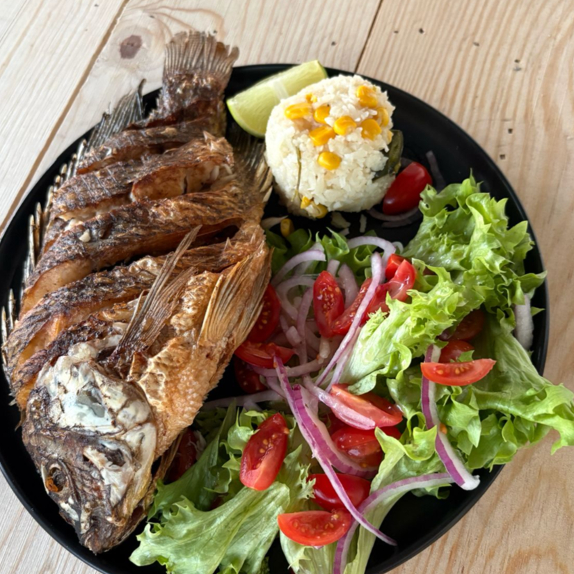 Mojarra fresca y crujiente, frita con ingredientes de la casa. Se acompaña de arroz blanco y ensalada fresca con aderezo.