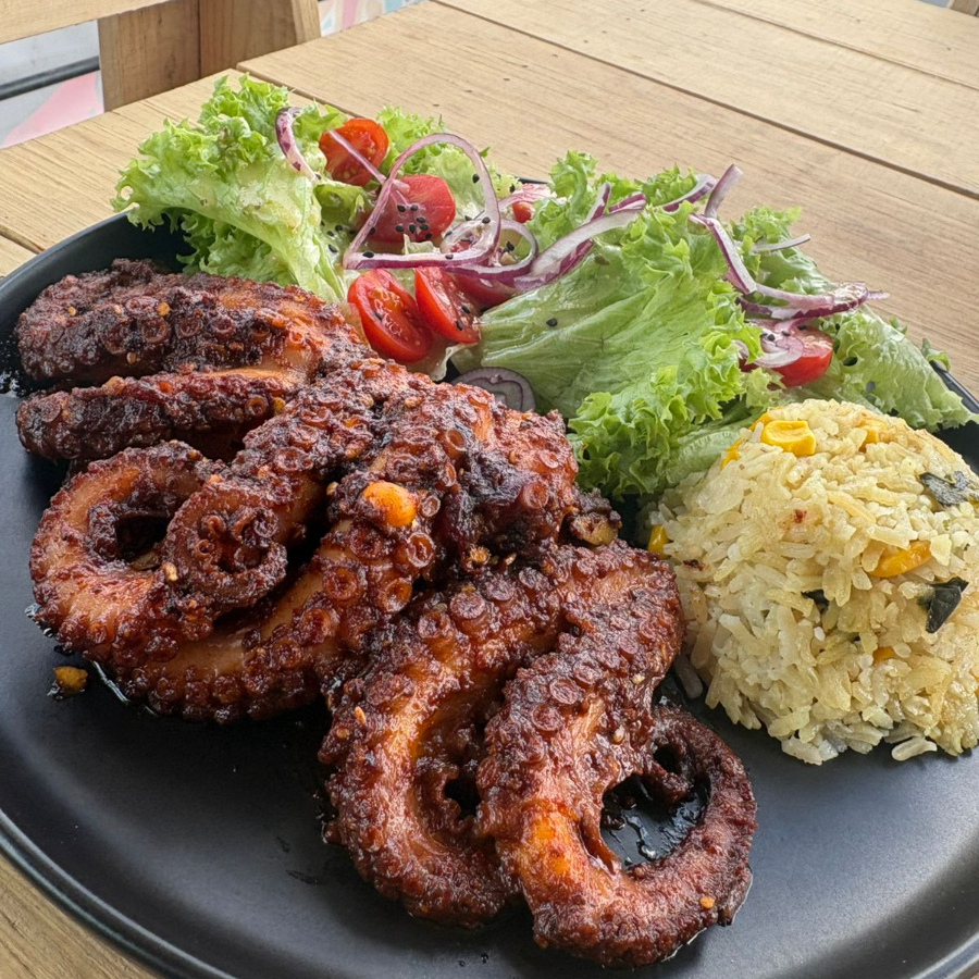 Exquisito pulpo cocinado en nuestra salsa de mantequilla secreta con ingredientes de la casa. Servido con arroz, ensalada fresca y un aderezo especial.