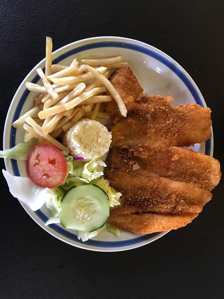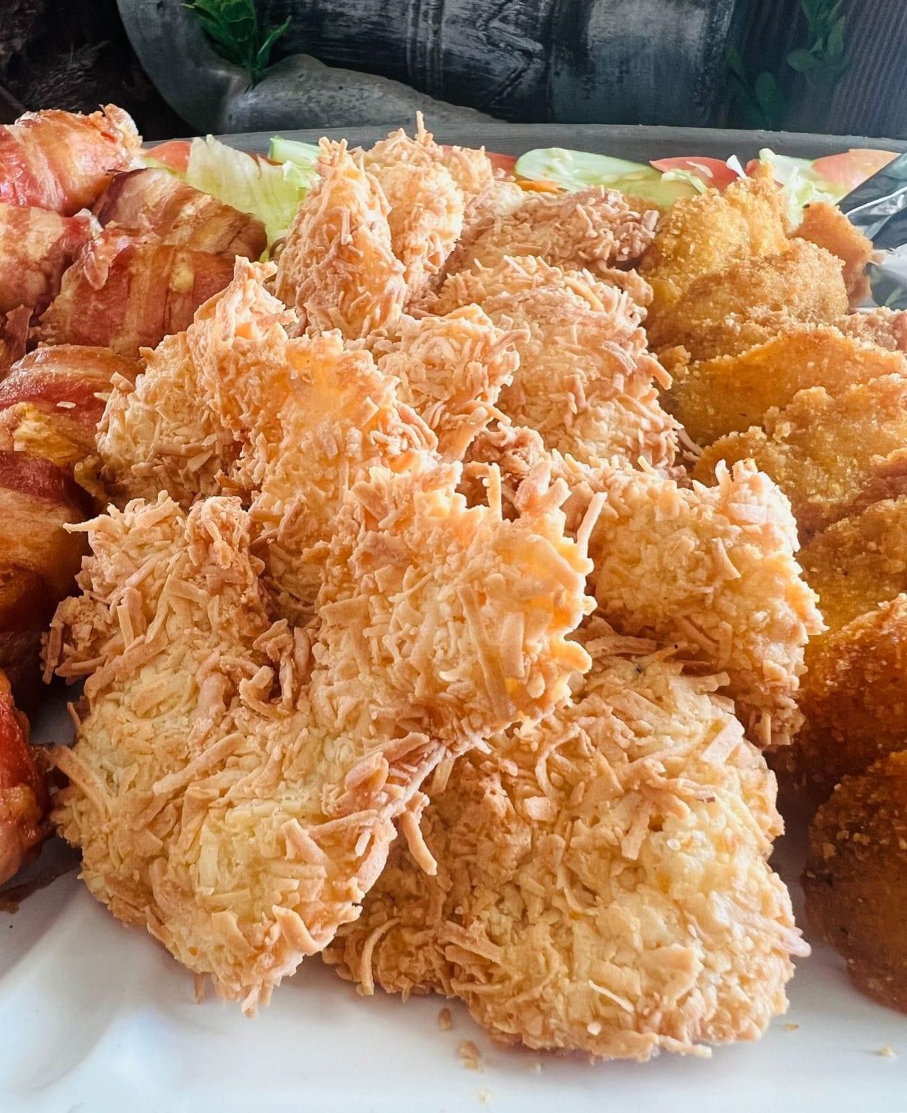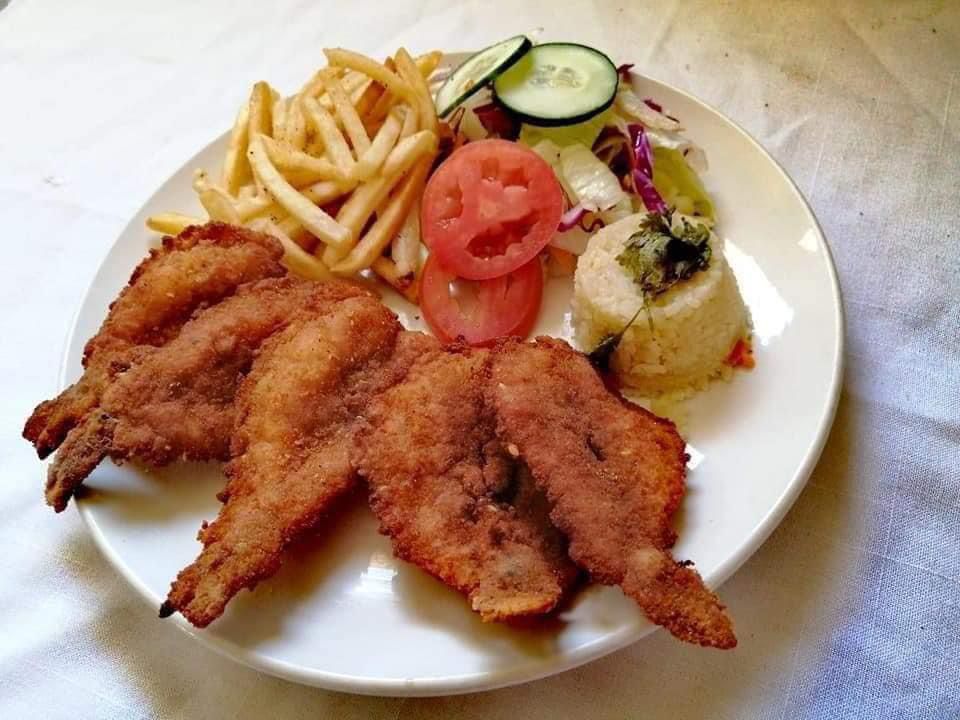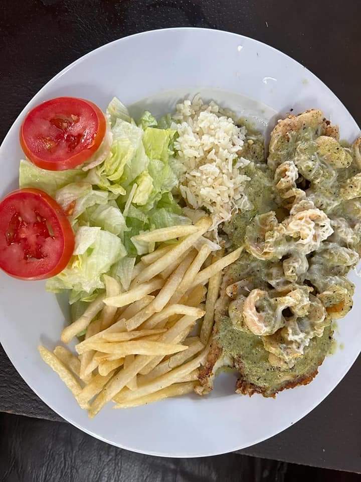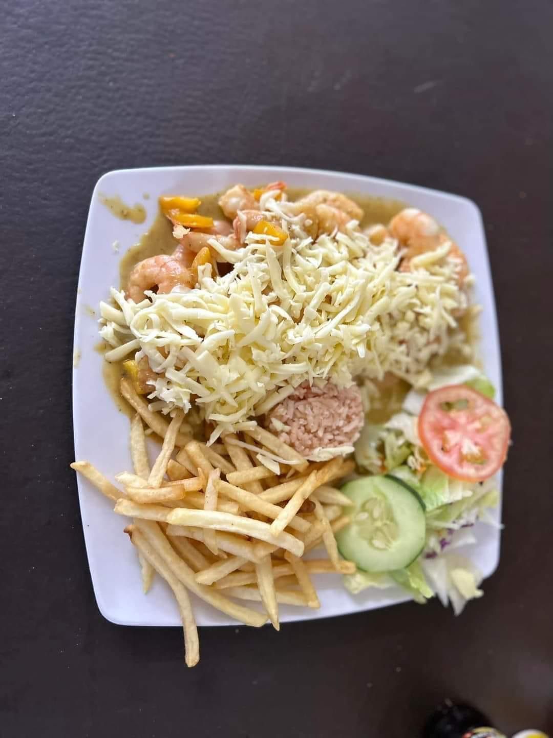 Camarones cocidos empanizado acompañado y papas a la francesa