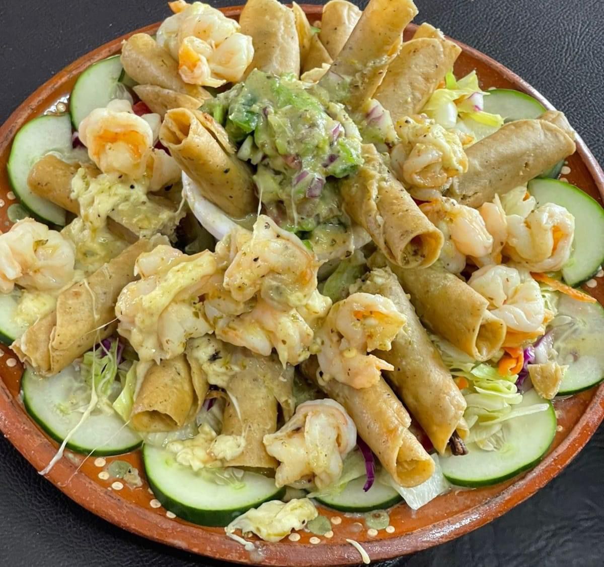 ¡Especialidad de la casa! Deliciosos Tacos Dorados de Carne (8) Con Topping de Camarón y Aguacate