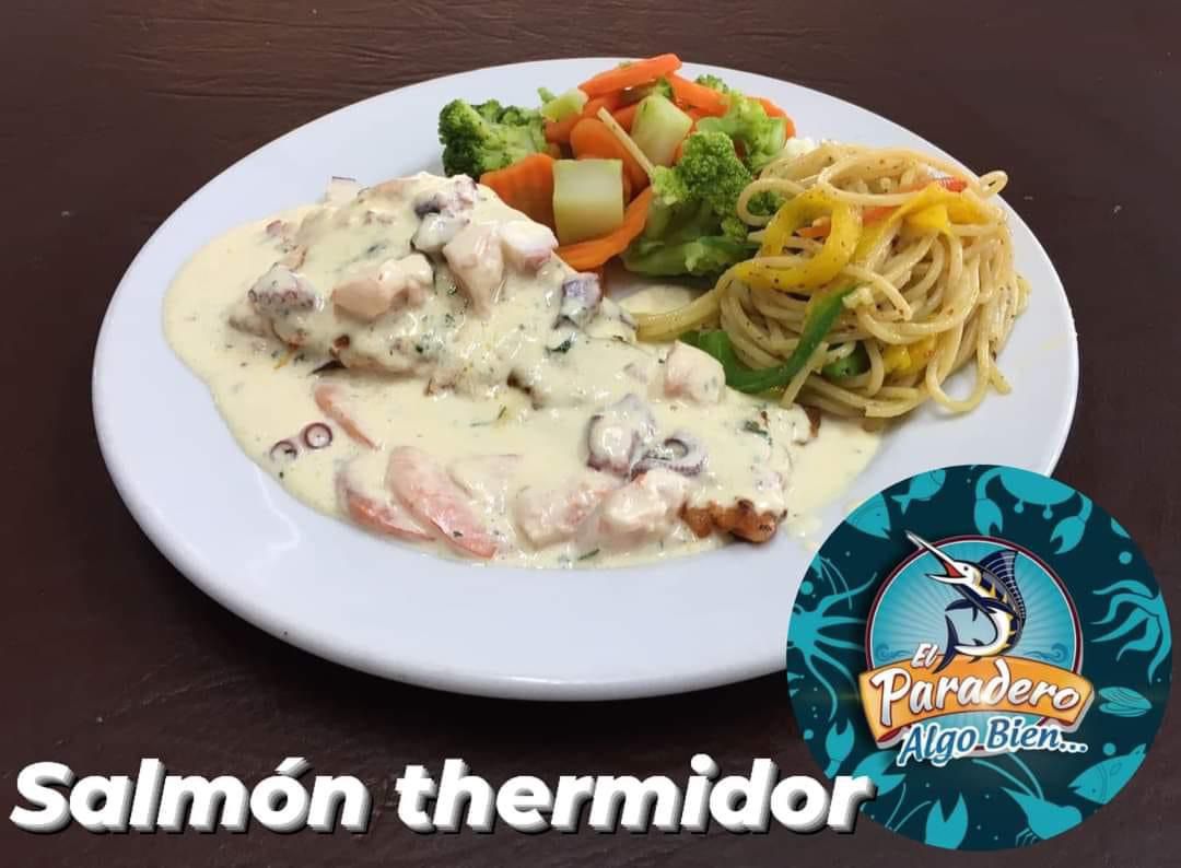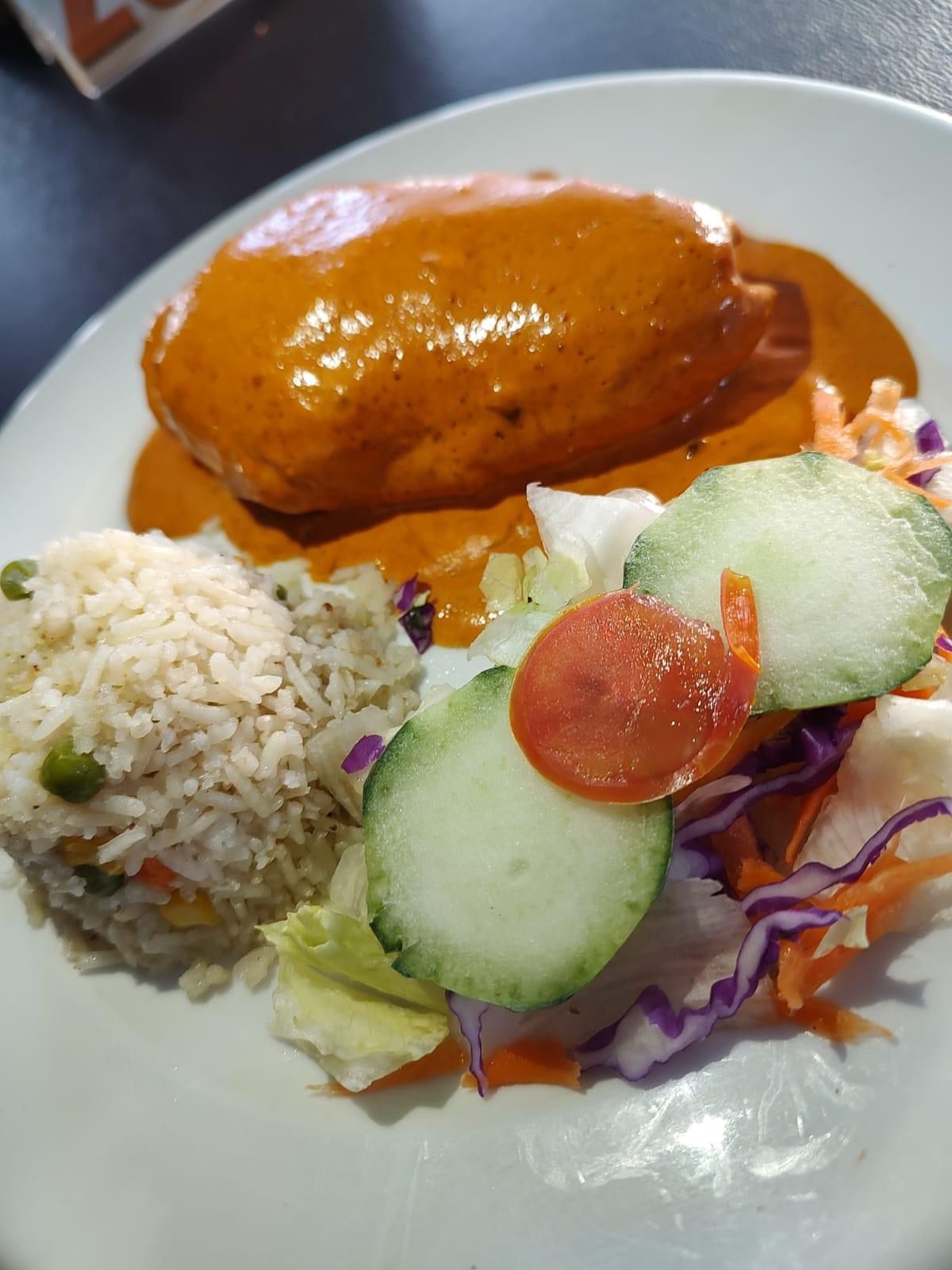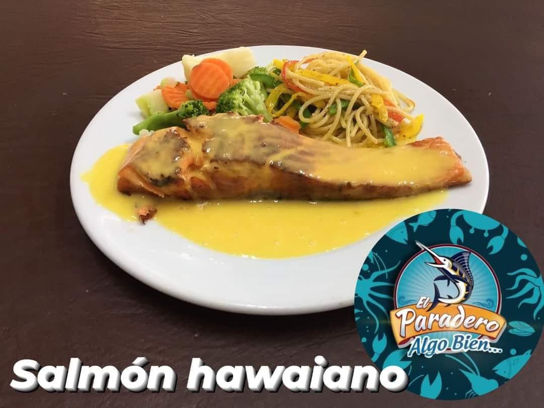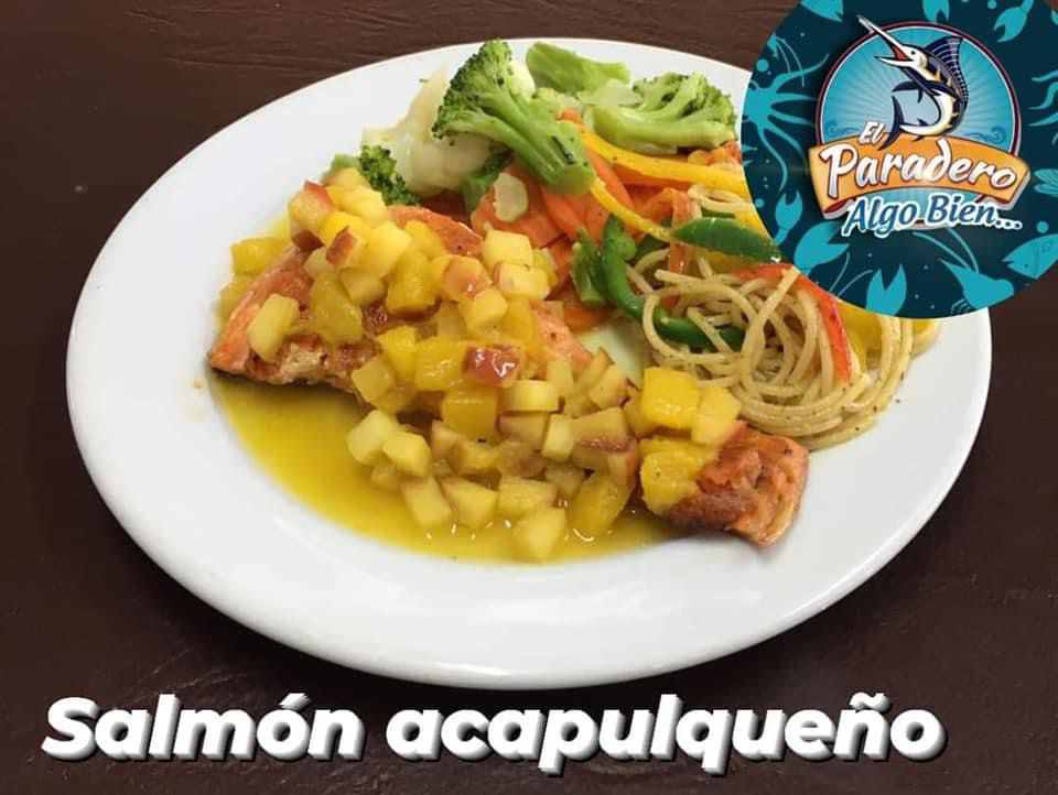 Salsa de mango, acompañados de spaguetti, verduras al vapor y puré.