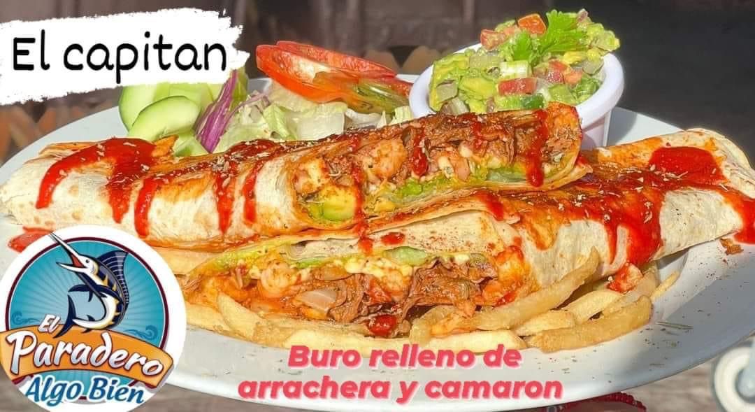 Delicioso Burro Relleno de Arrachera y Camarón. 1 PIEZA tamaño regular acompañado de Ensalada.