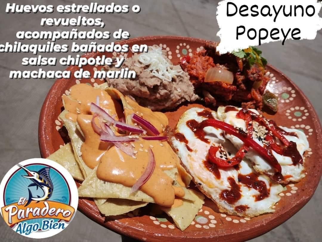 Huevos Estrellados o Revueltos (2), Acompañados de Chilaquiles bañados en Salsa Chipotle y machaca de Marlín.