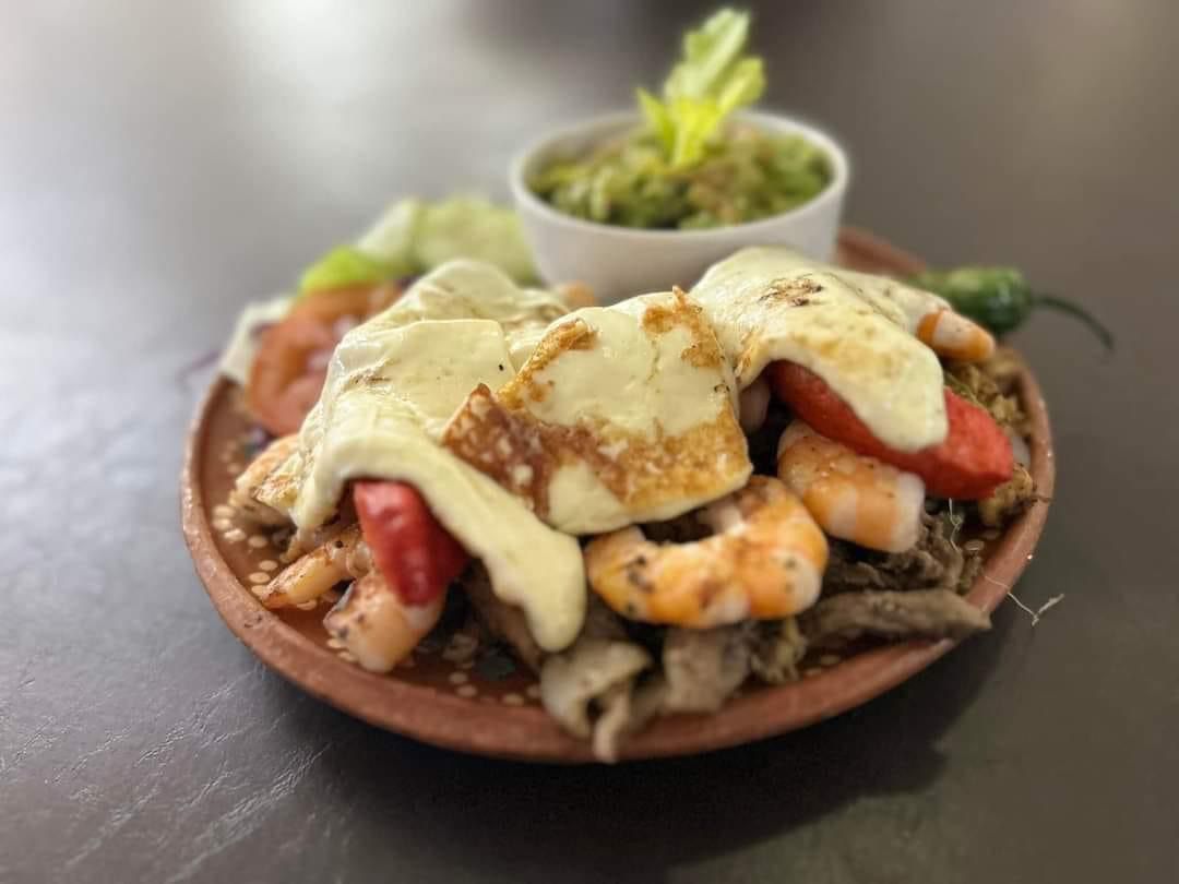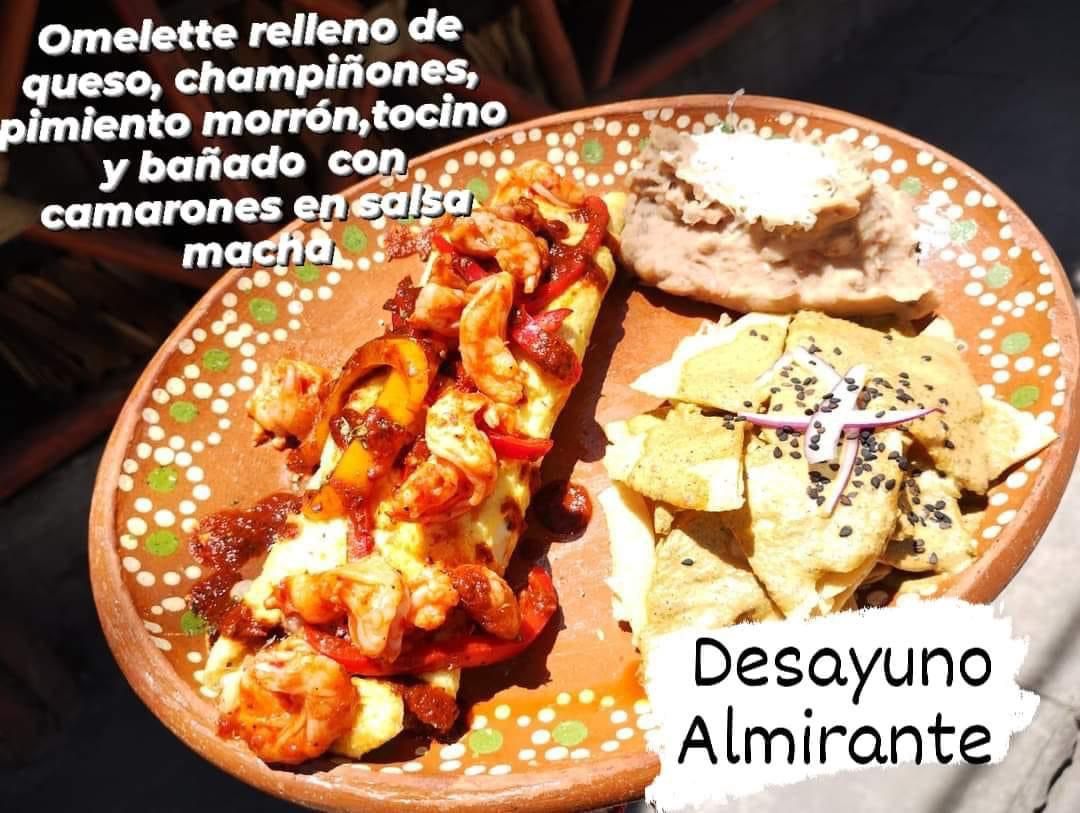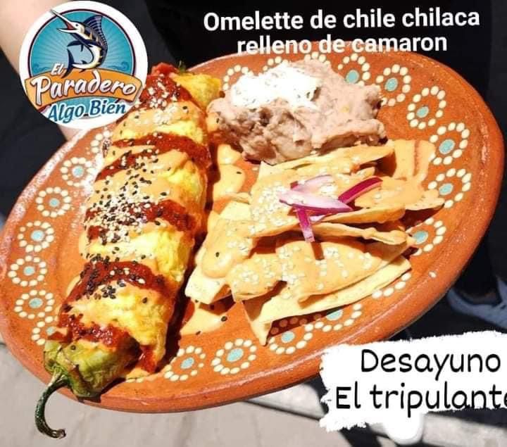 Omellete de Chile Chilaca relleno de Camarón, acompañado de chilaquiles.