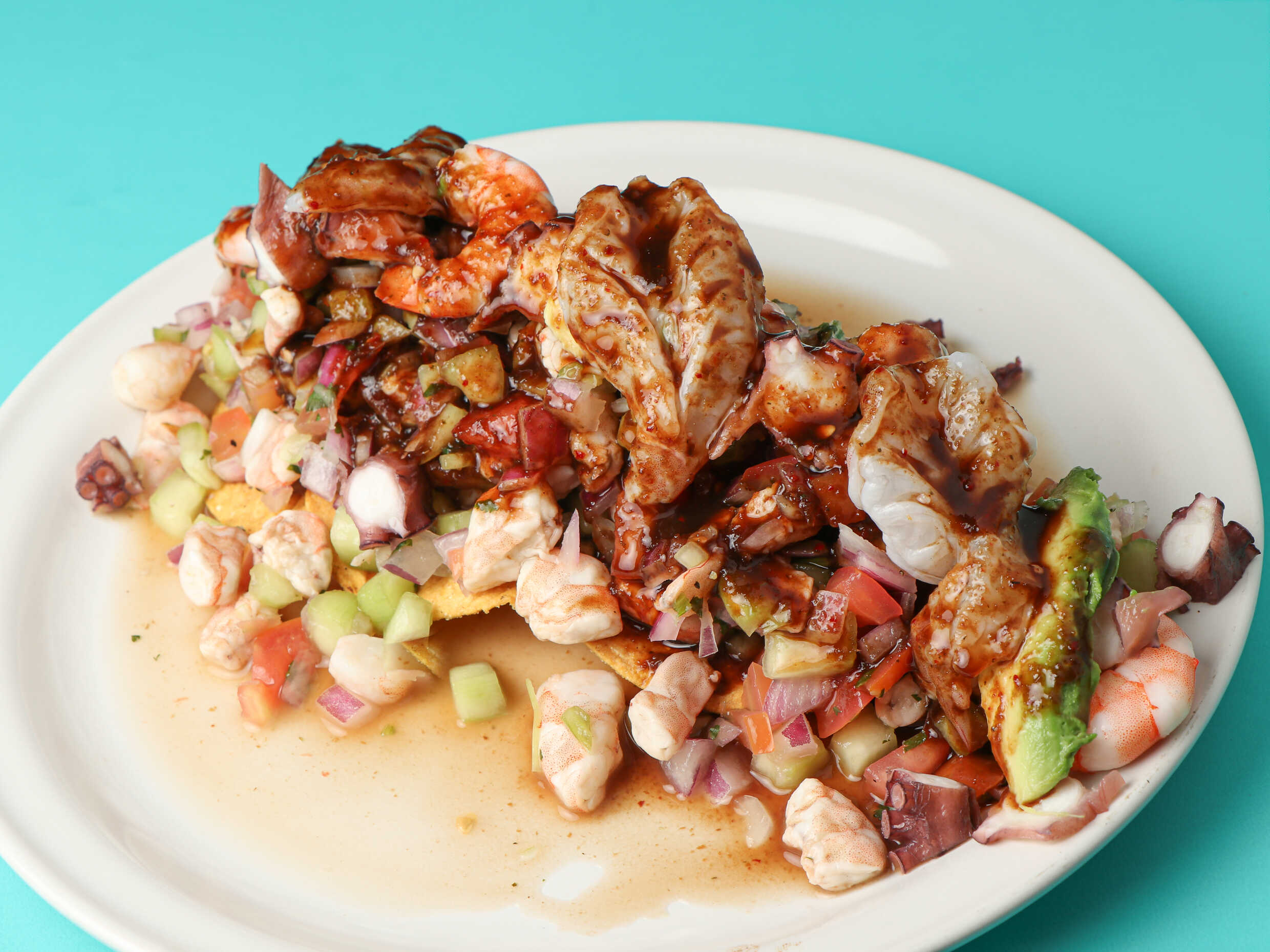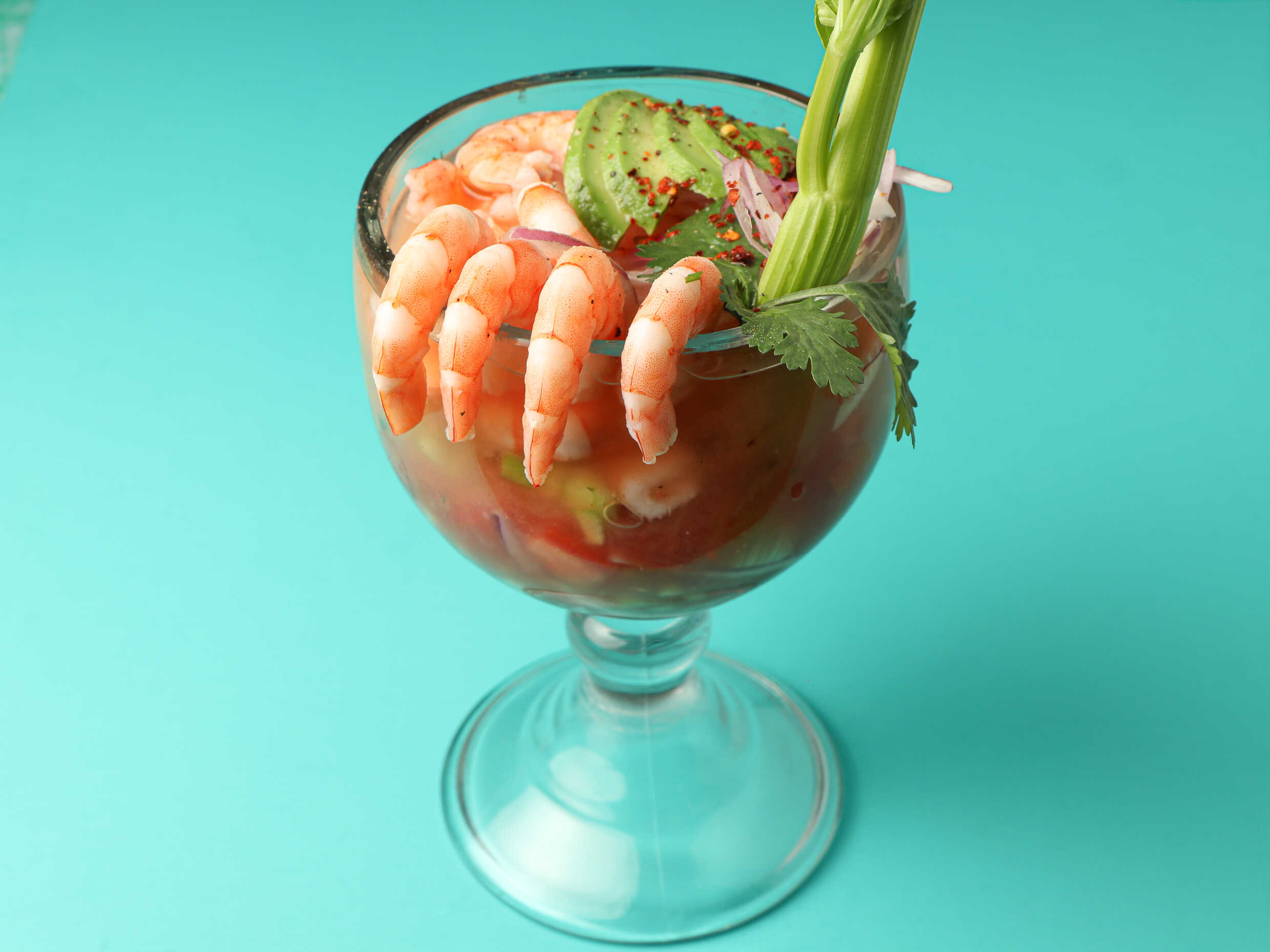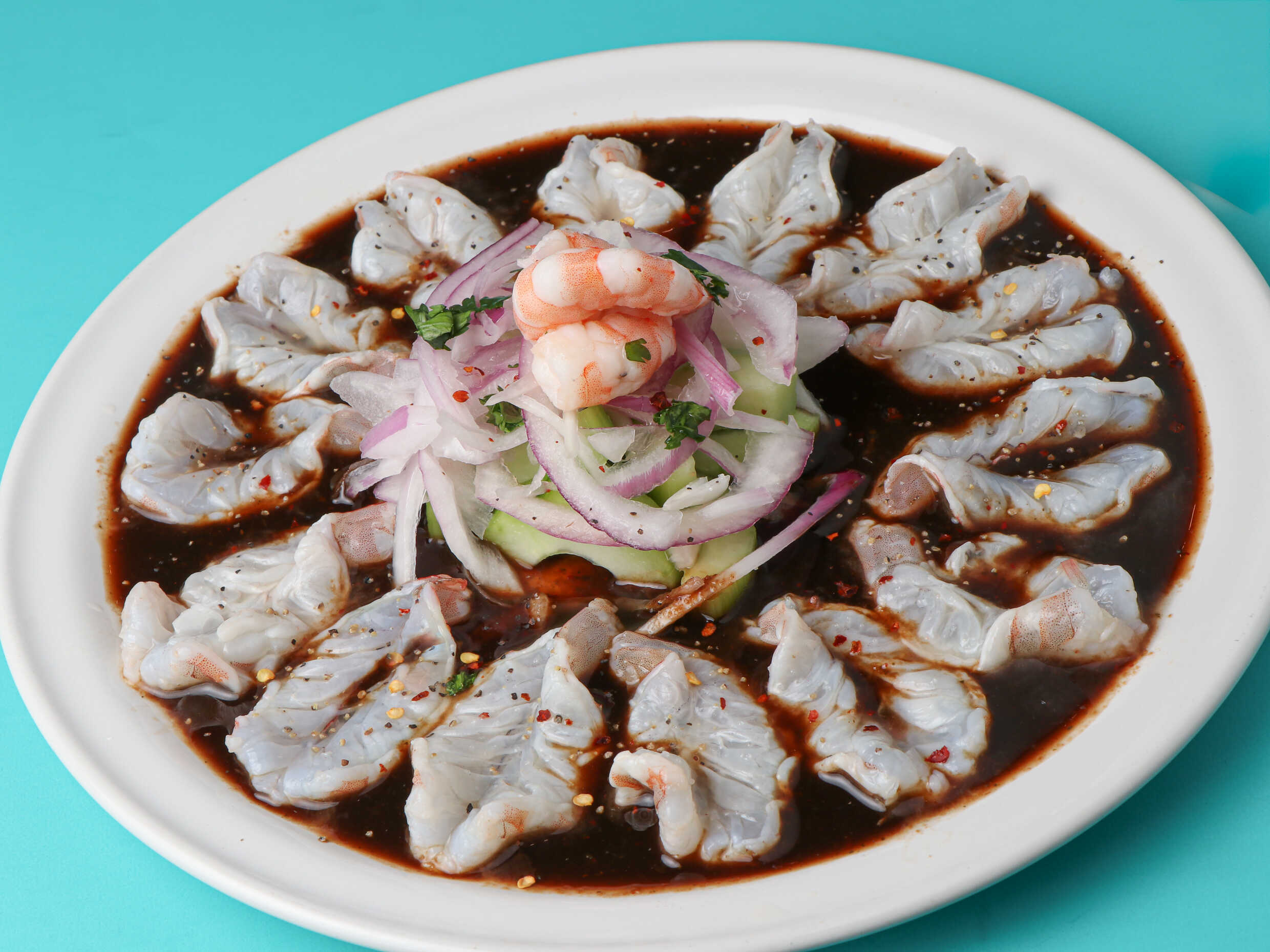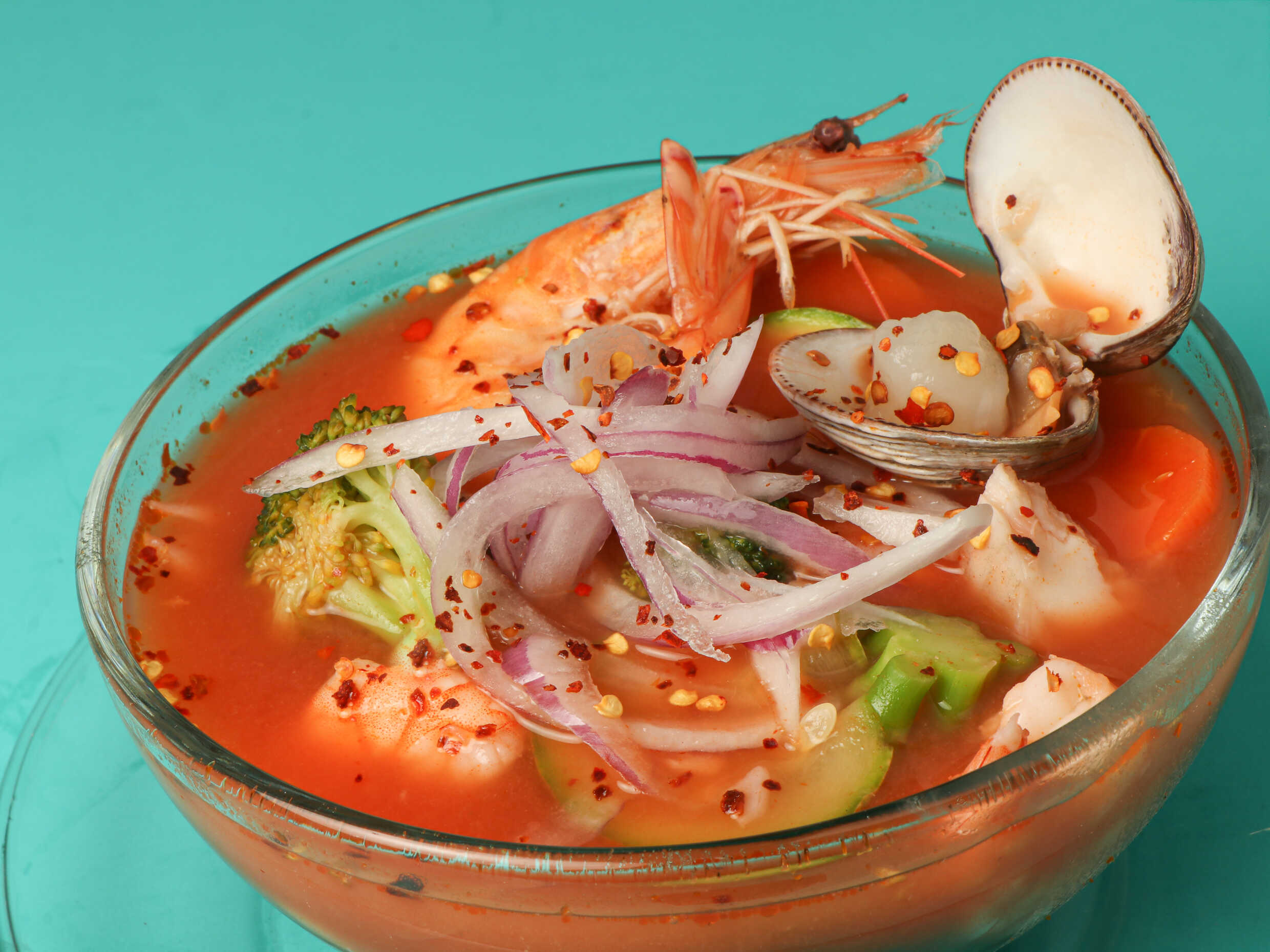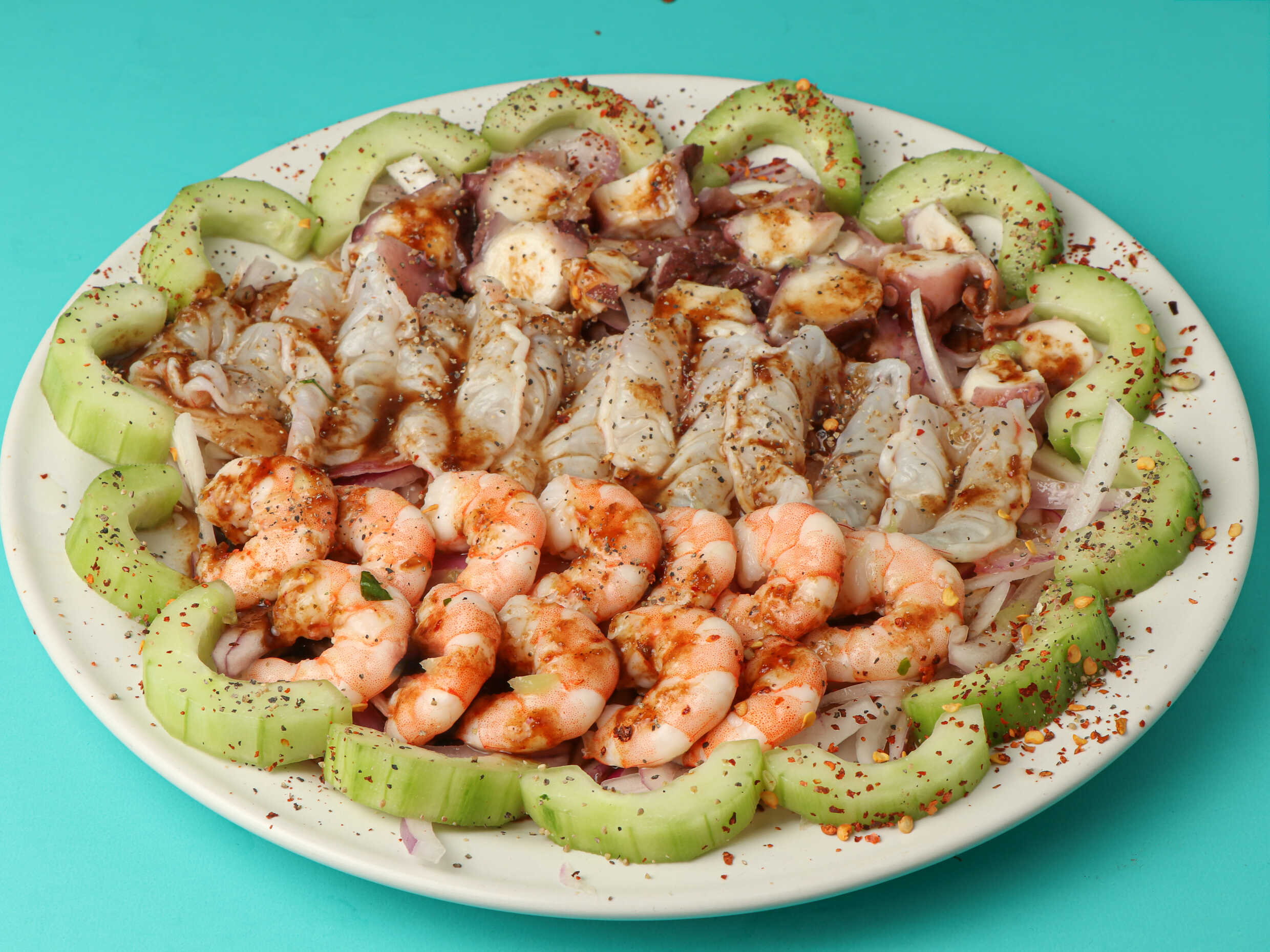 Ceviche de camarón, aguachile de camarón, pulpo, pepino, cebolla morada chiltepín, bañado en salsa roja.