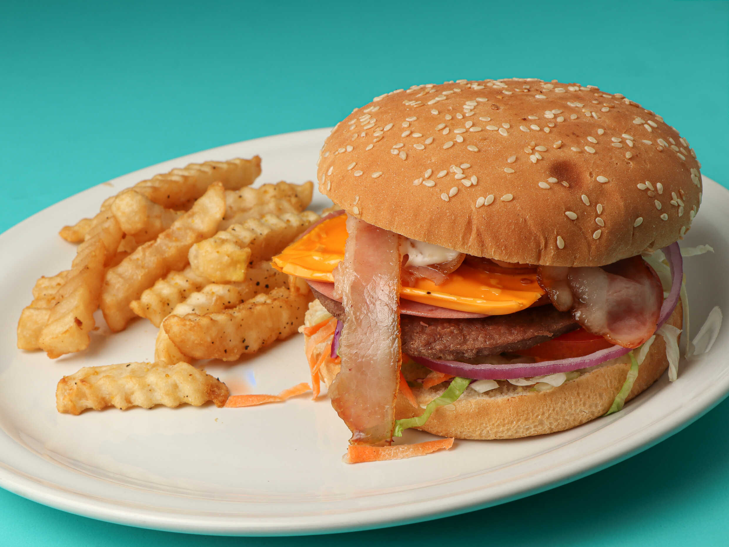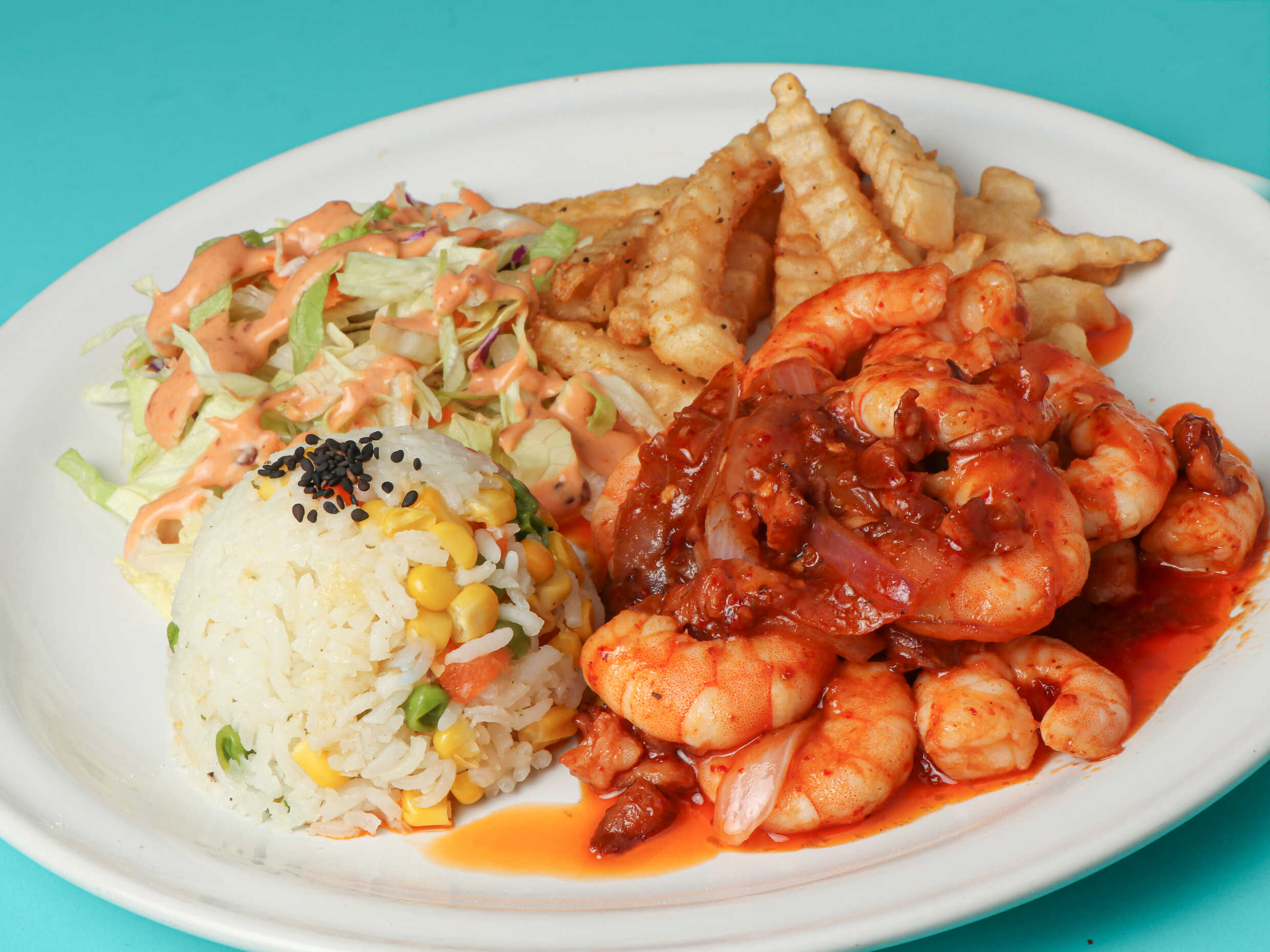 Camarón, tocino, cebolla, queso, lechuga, tomate y un toque de aderezo chipotle.