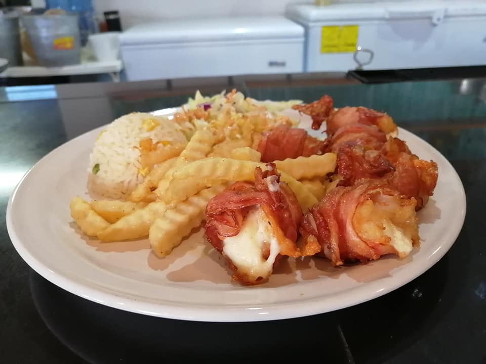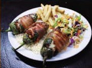 Acompañado 3 chiles jalapeños rellenos de camarón, queso crema, envueltos en tocino acompañados de arroz y verduras.