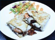 Camarón, chile morrón, cebolla morada, queso, tocino, acompañado de lechuga tomate y cebolla.
