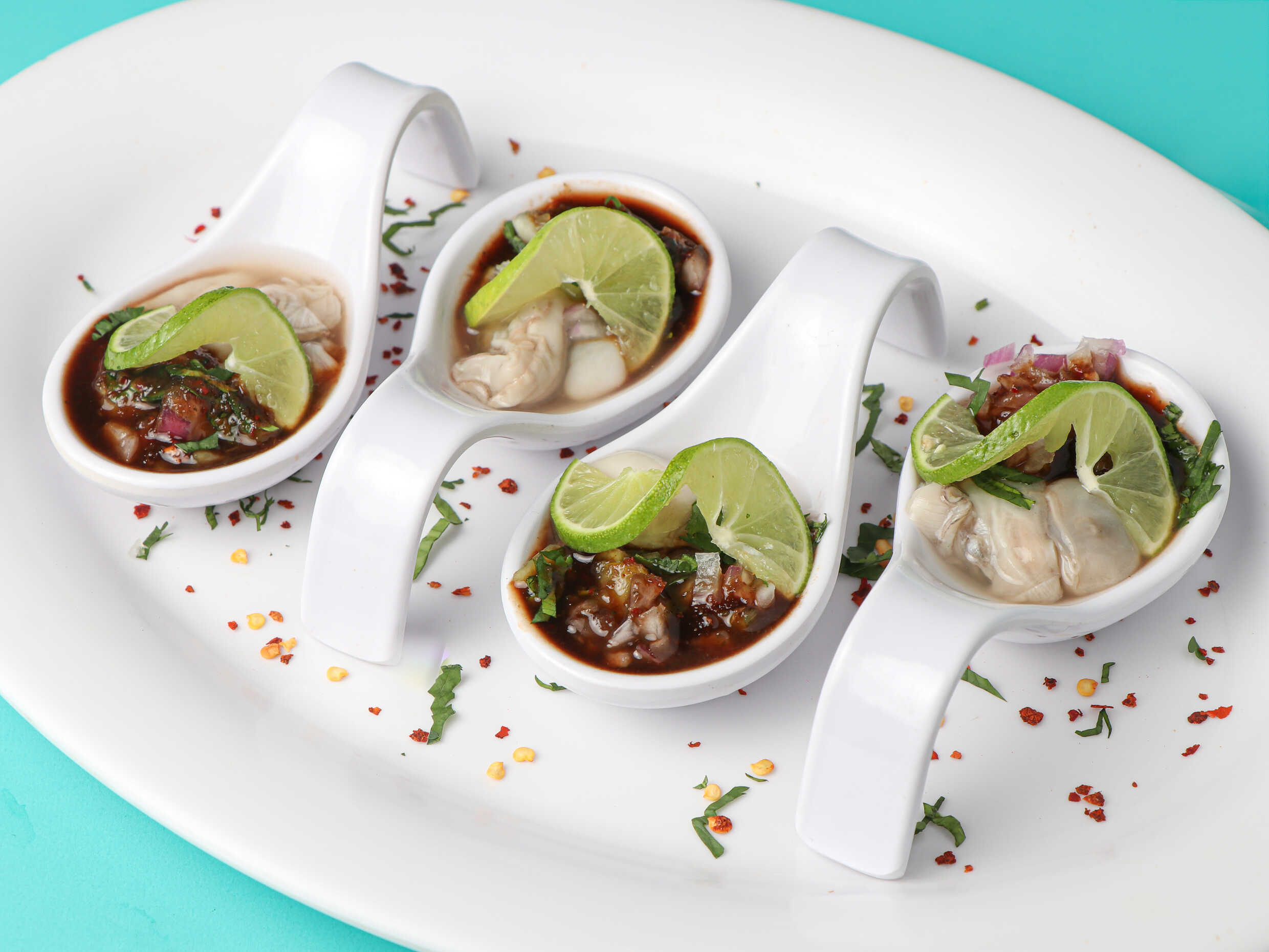 Camarón cocido, ceviche de camarón, pulpo, aguachile, almeja, pepino, bañados en salsa de chiles.