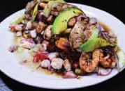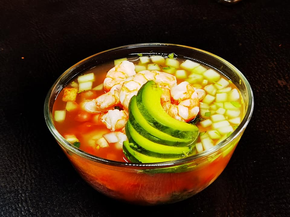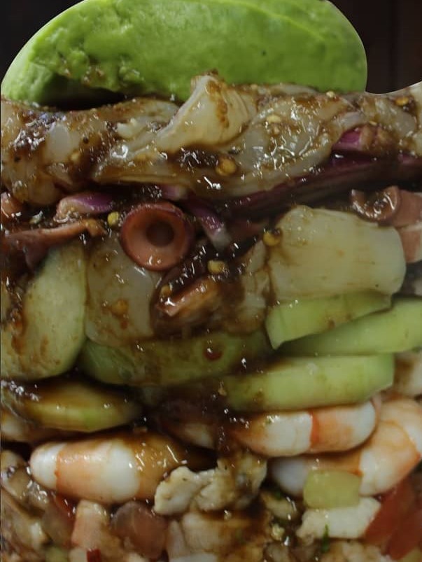 Aguachile camarón, pulpo, almeja, cebolla, pepino, aguacate, salsa.