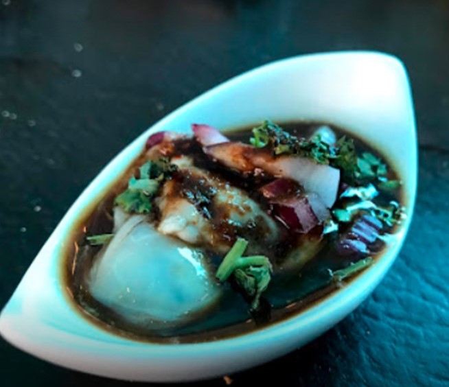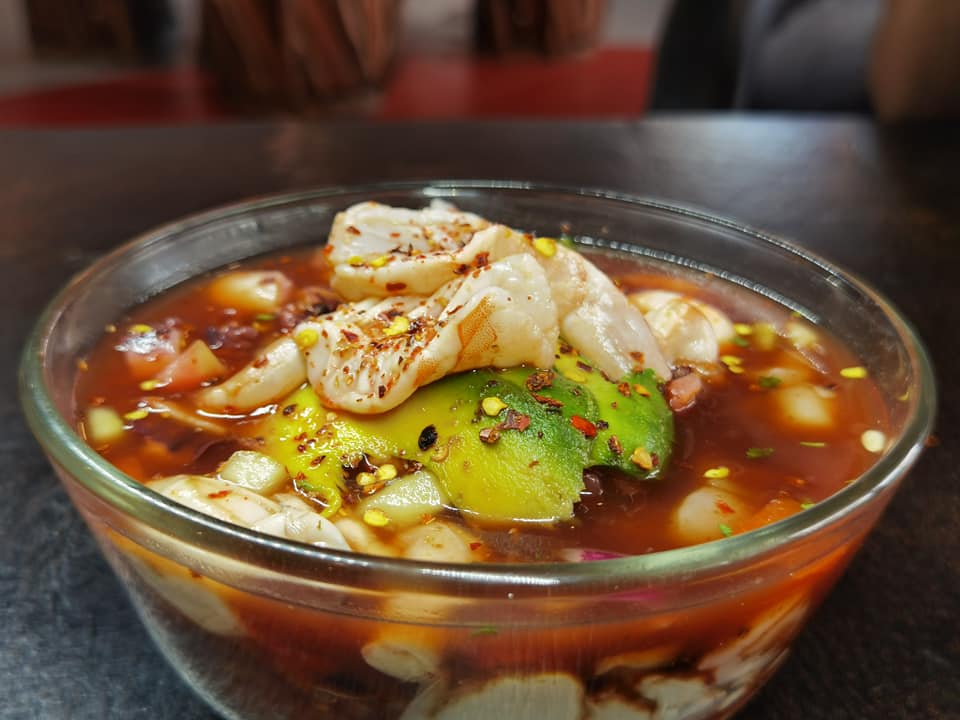 Ceviche de camarón, aguachile de camarón, pulpo, pepino, cebolla morada chiltepín, bañado en salsa roja.