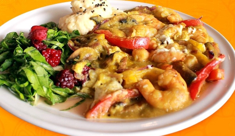 Chile habanero, camarón y pulpo a la plancha, tocino, cebolla y queso acompañado de verduras.