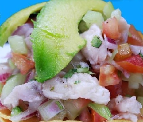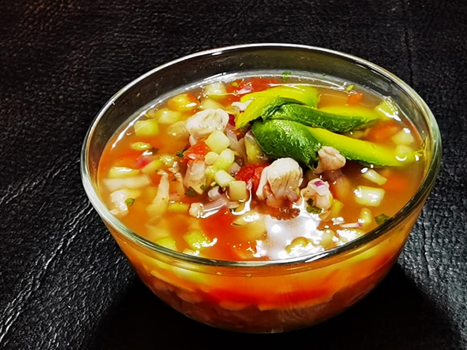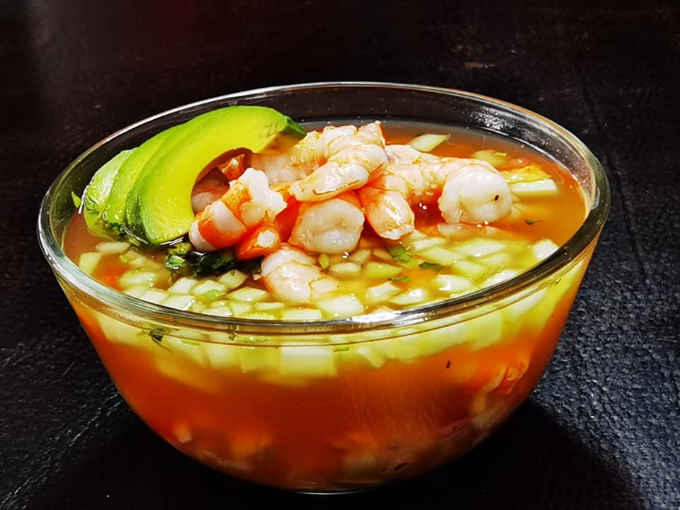 Ceviche de camarón, ceviche de pescado, camarón cocido, coco, mango, pepino, clamato, aguacate perejil.
