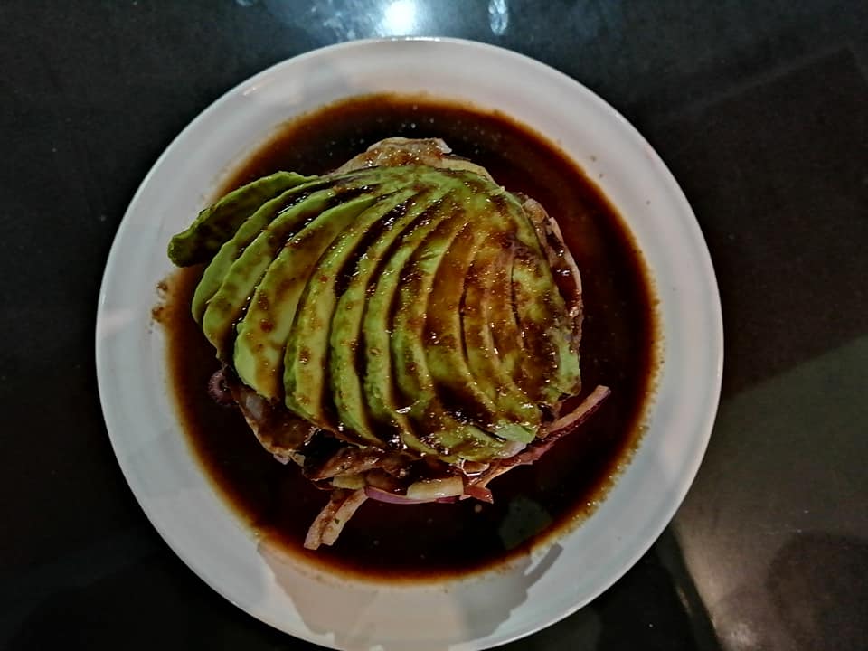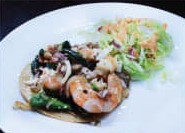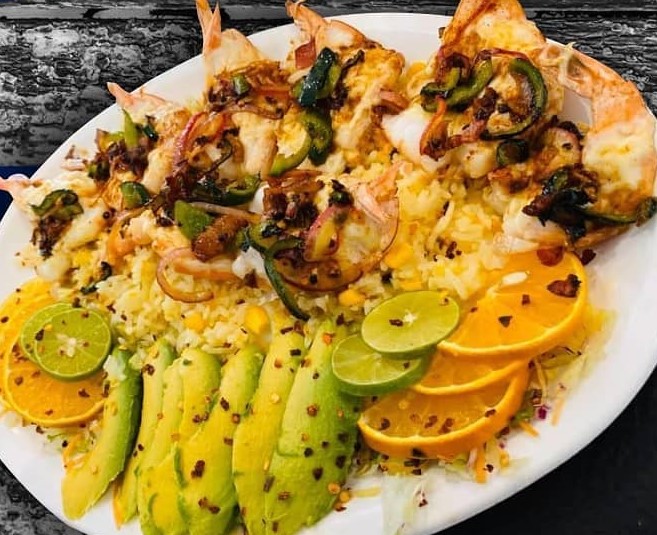 Camarón, chile morrón, cebolla morada, queso, tocino, acompañado de lechuga tomate y cebolla.