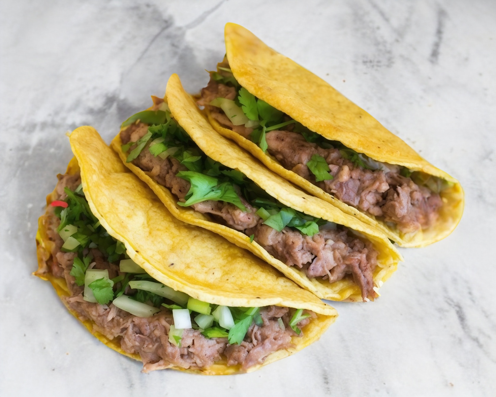 6 Deliciosos tacos dorados con carne de res, acompañados de lechuga, crema, cueritos, deliciosa salsa casera y salsa de tomate de la casa
