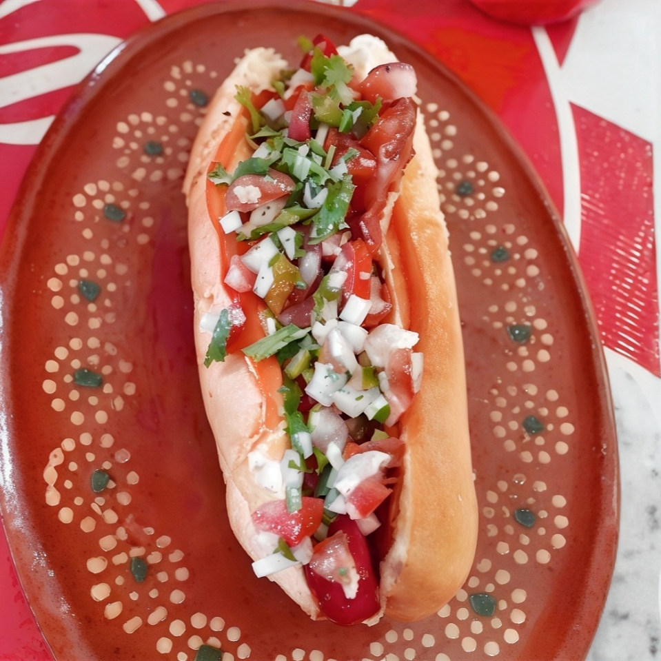 Salchicha, aderezos, chiles curtidos o pico de gallo.