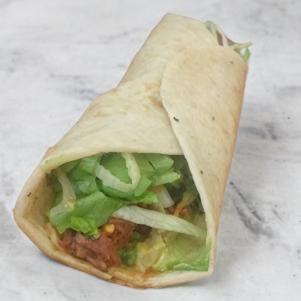 Salchichas envueltas en tortilla doradas, lechuga, tomate crema, queso amarillo y salsa.
