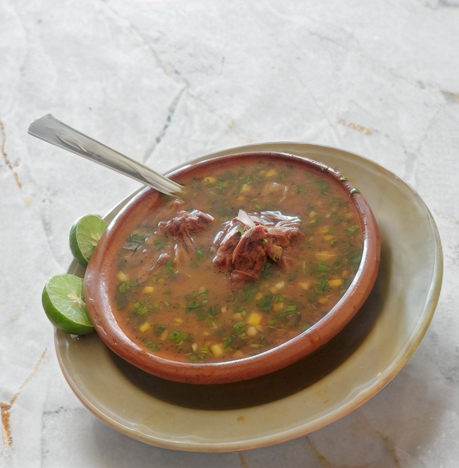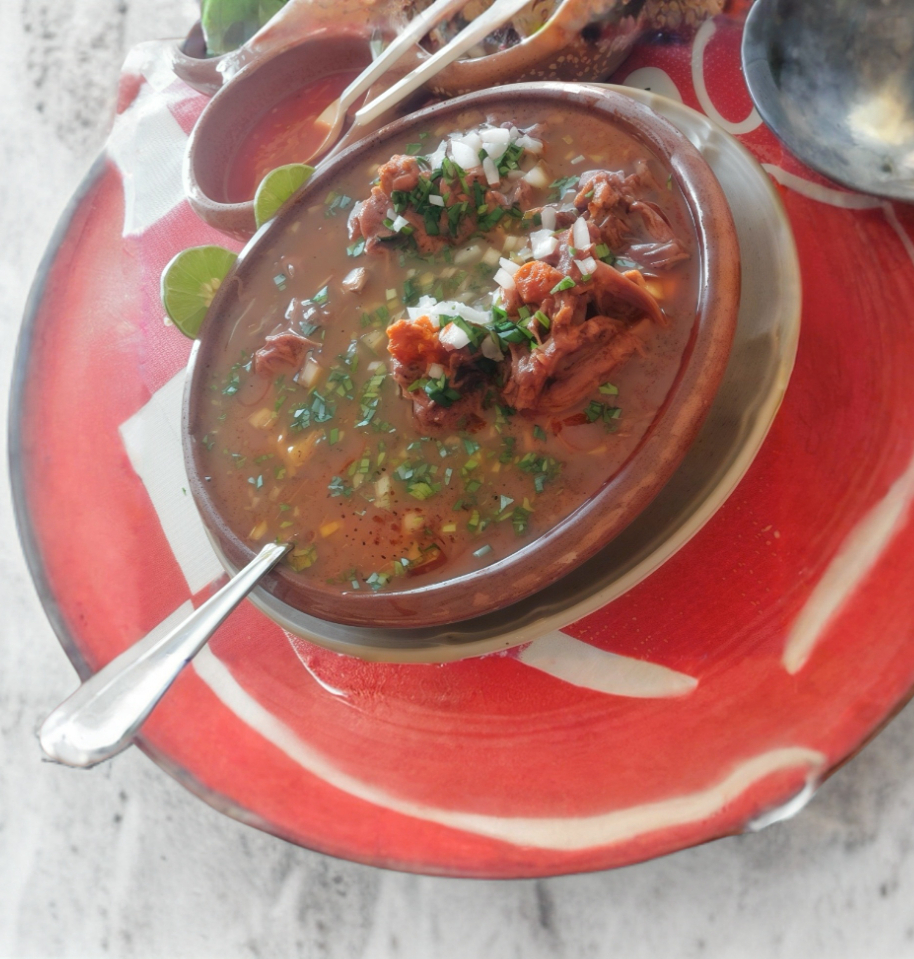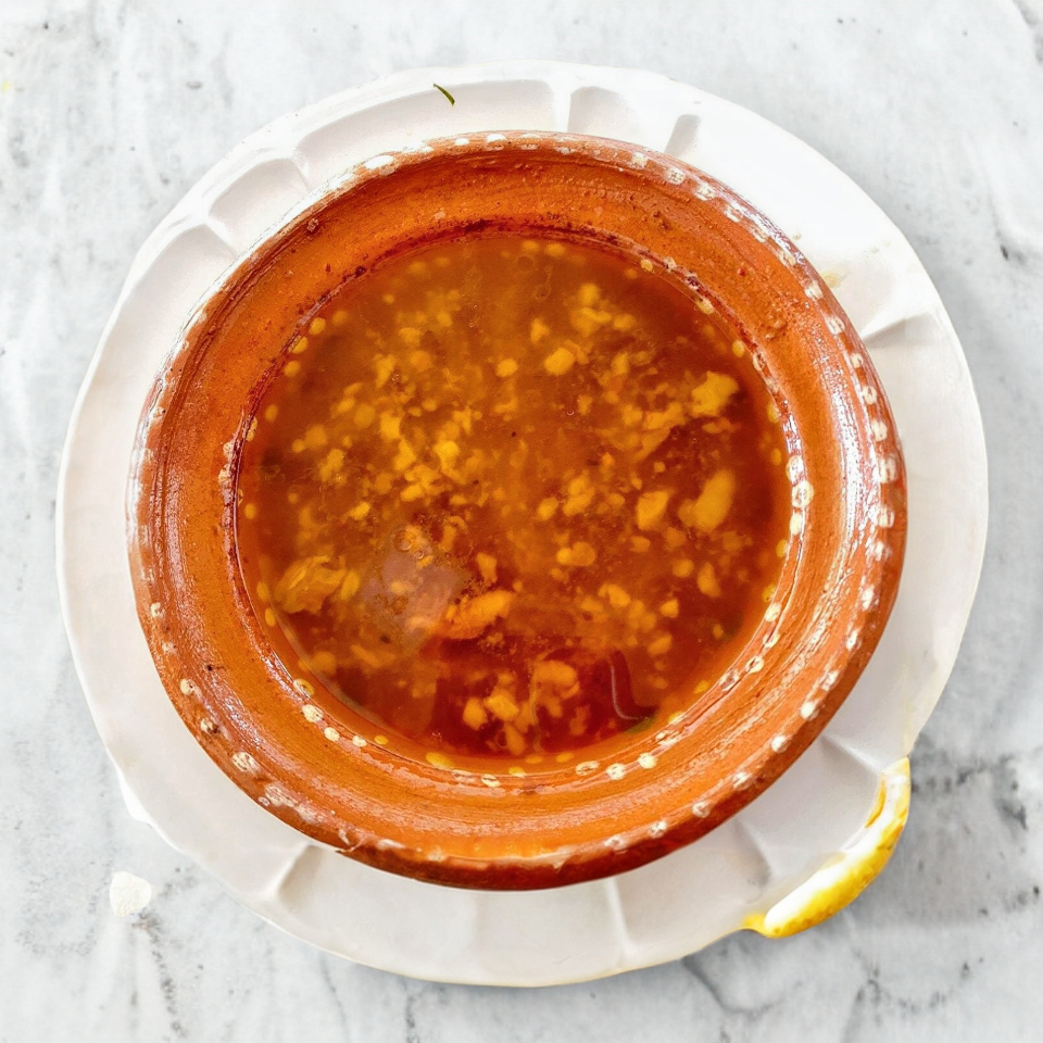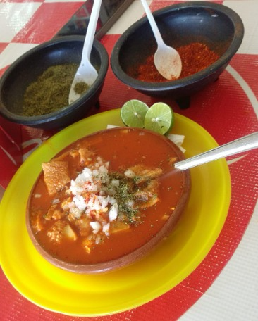 Pancita de res con maíz pozolero en chile rojo. Menudo grande de 1 litro.