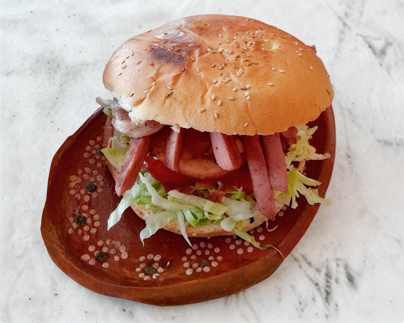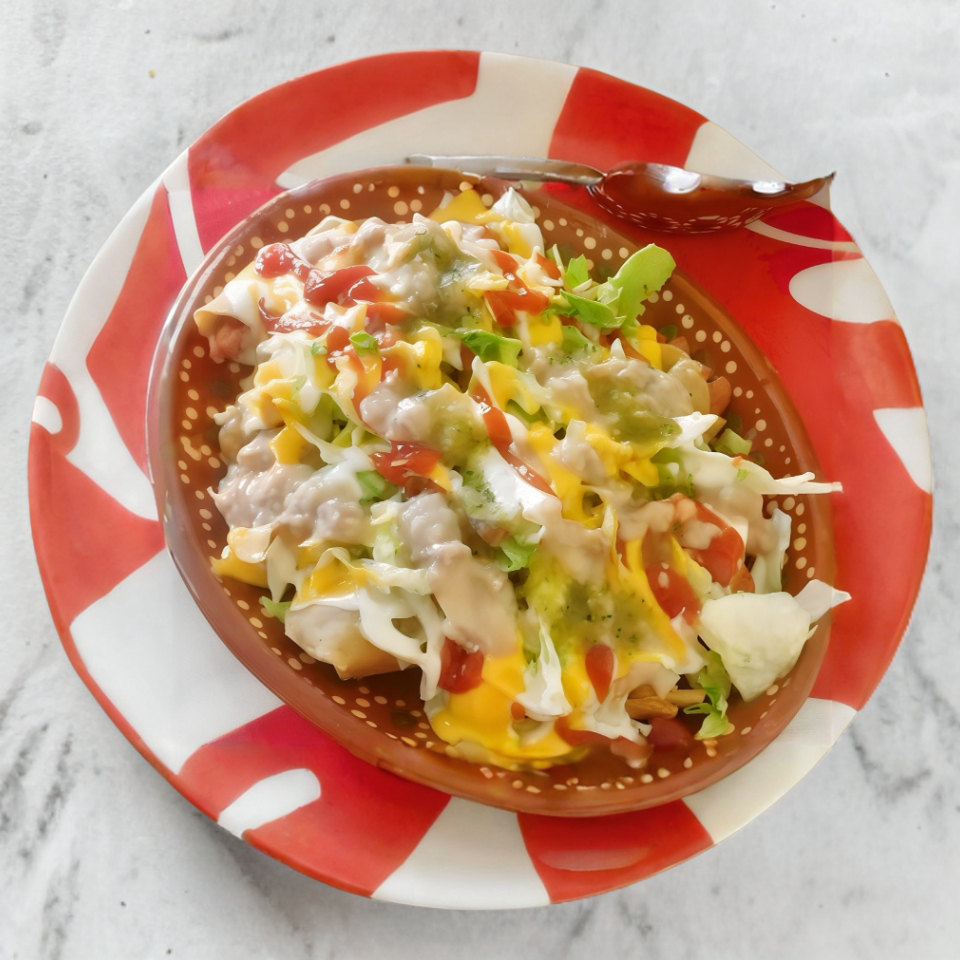 Carne de res, queso amarillo, jitomates, cebolla, lechuga y aderezos.