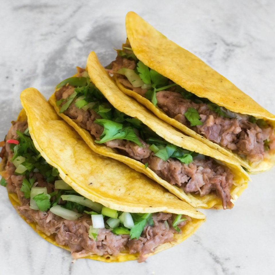 Carne de birria de res en tortilla de harina con aguacate y mayonesa.