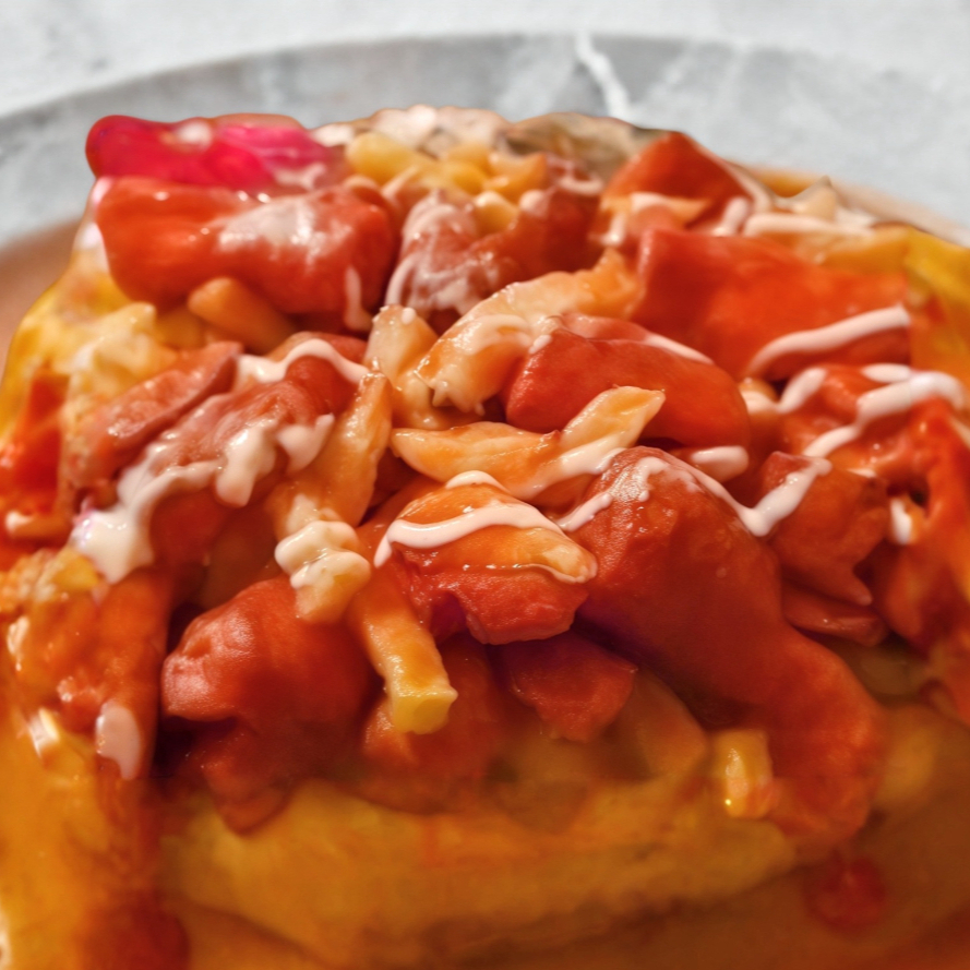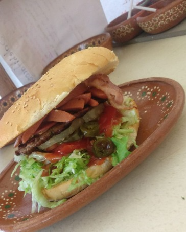 Carne de res, queso amarillo, jitomates, cebolla lechuga, piña tocino y aderezos.