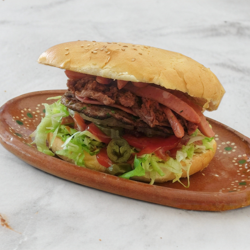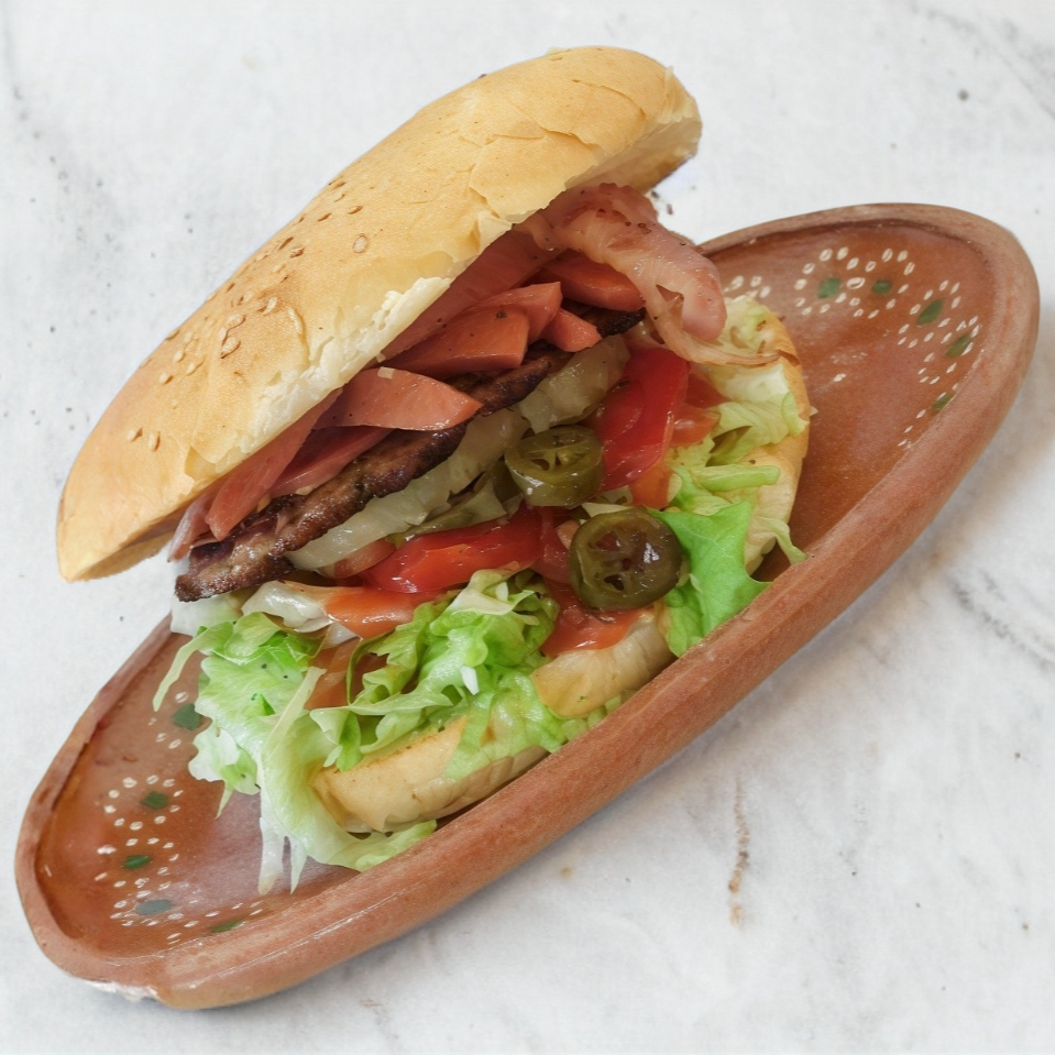 Doble Carne de res, queso amarillo, jitomates, cebolla, lechuga, tocino y aderezos.