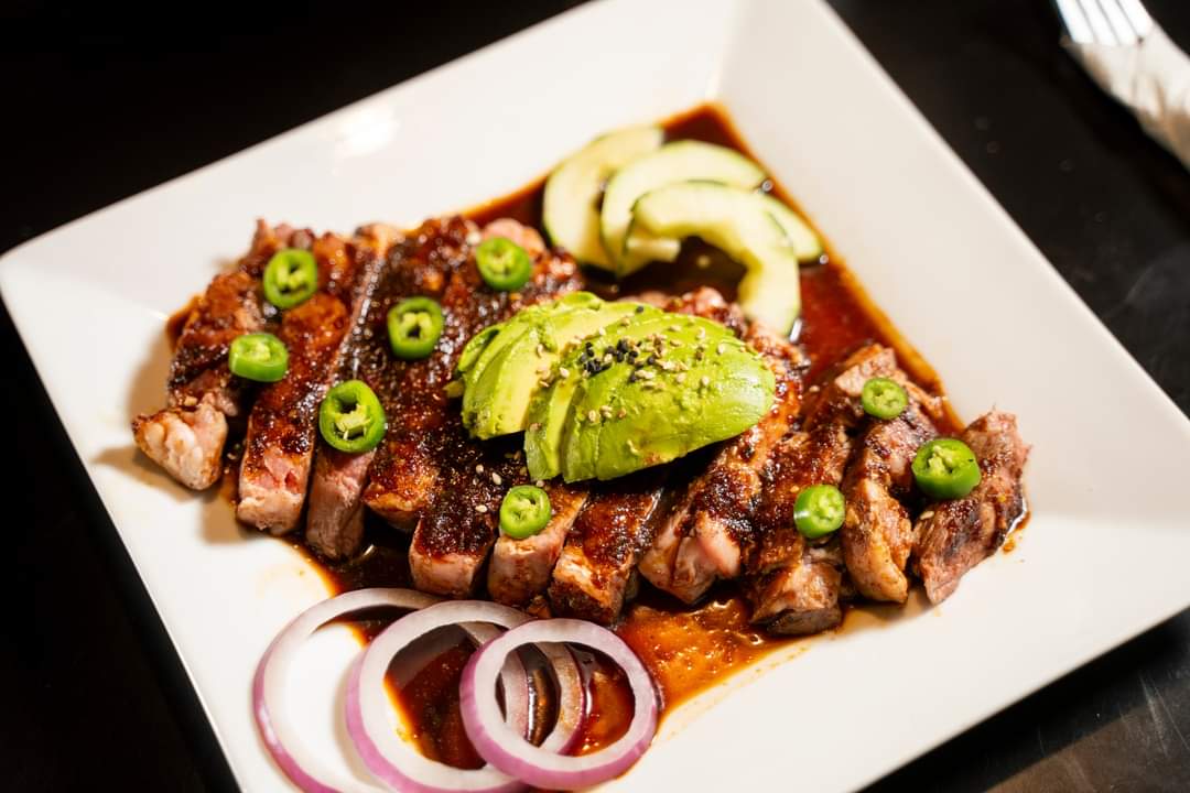 Rib Eye termino medio, bañado en salsa de la casa.