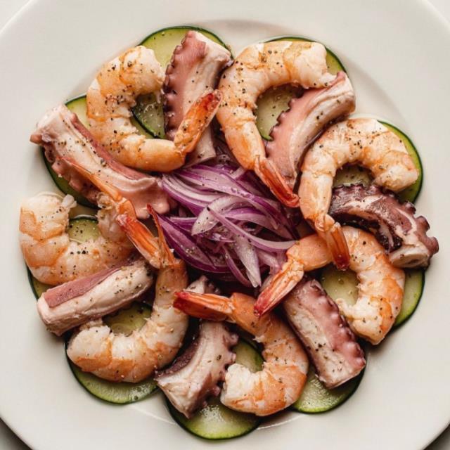 Camarón Cocido, Camarón Curtido y Pulpo en salsa especial de la casa.