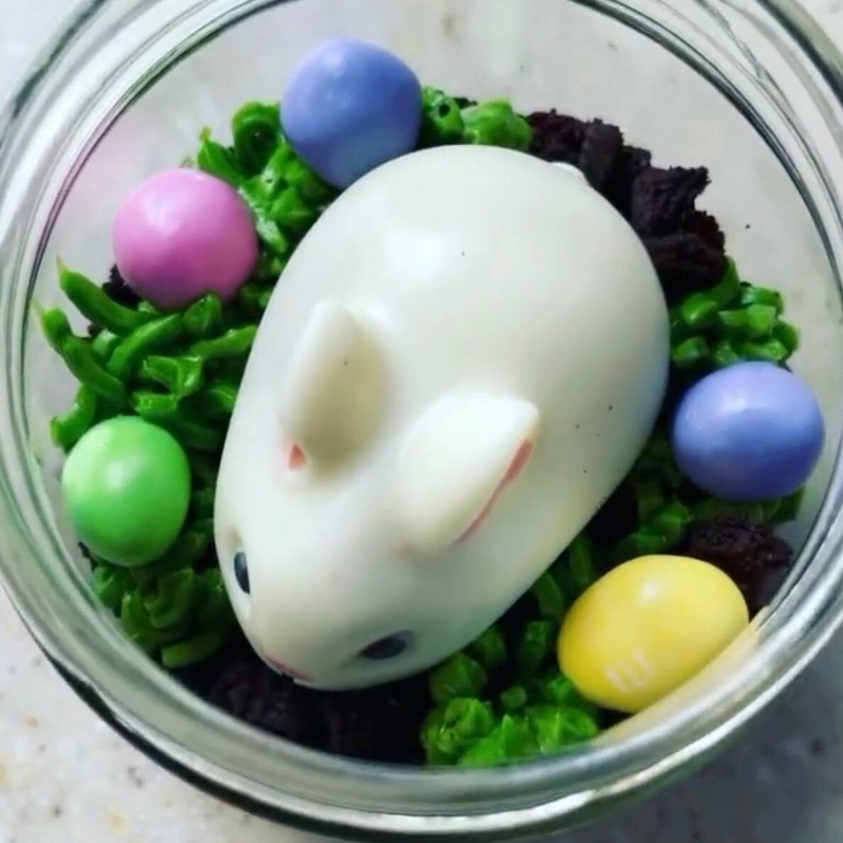 Pastel de chocolate con conejito de chocolate blanco relleno de pastel con dulce de leche, merengue suizo y huesitos de chocolate