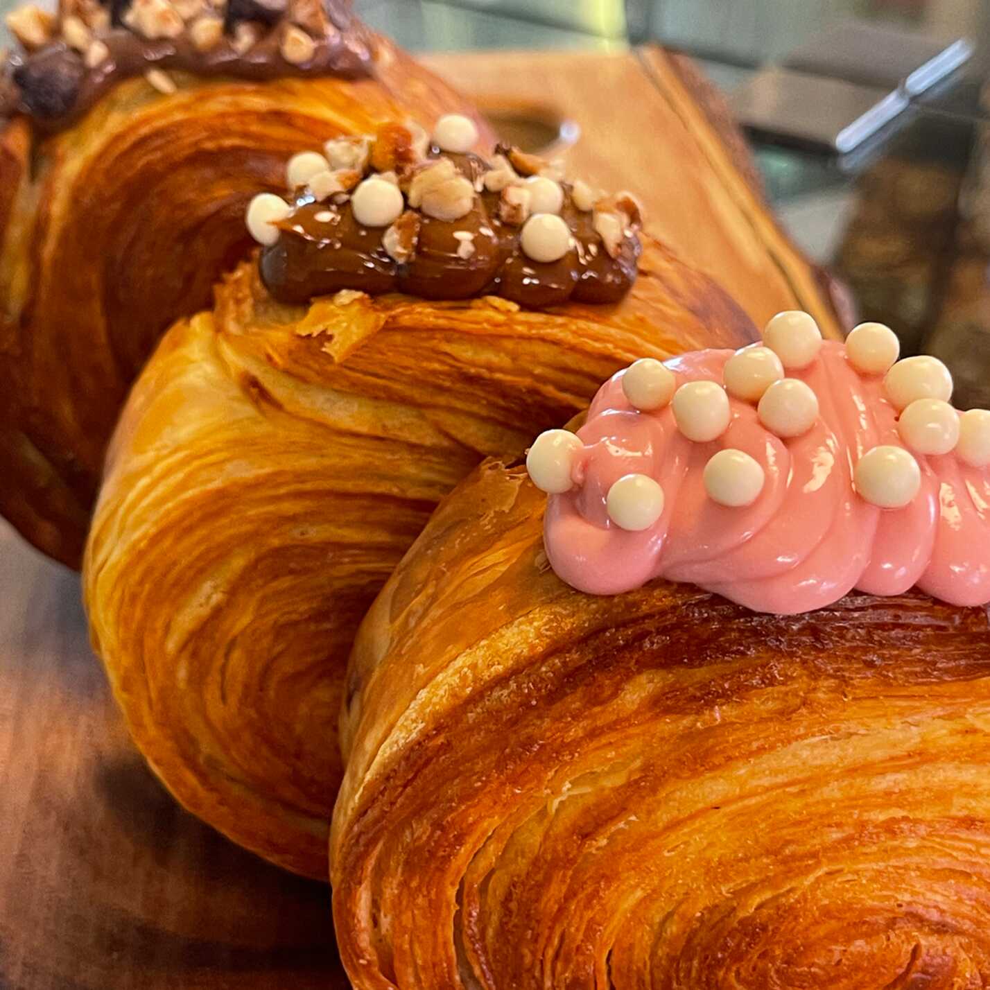 Galleta de red velvet rellena de pastel de red velvet coronada con betun de queso crema y perlas de arroz inflado cubiertas con chocolate de fresa