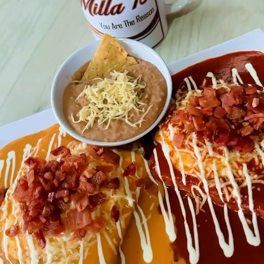 2 huevos revueltos cocinados a la perfección con una sabrosa mezcla de carne seca deshebrada y salsa mexicana tradicional.