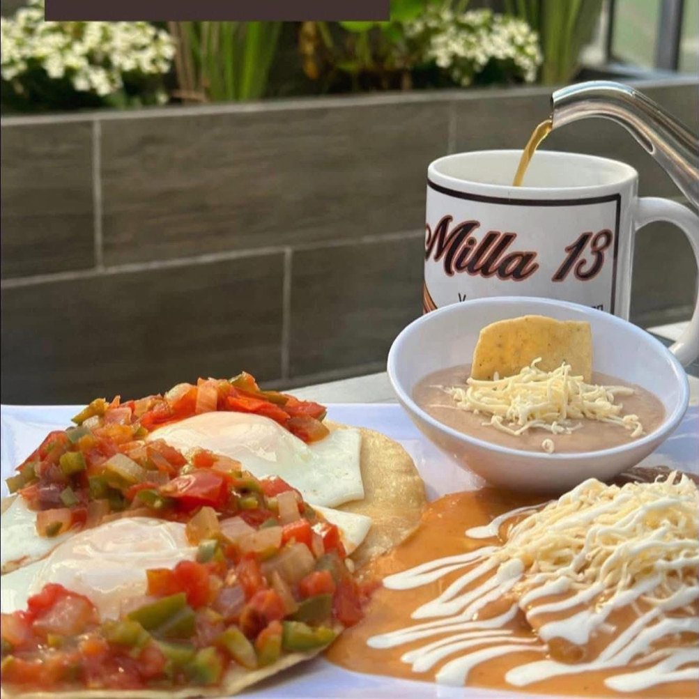 Acompañados de 1 huevo sobre pan con mantequilla bañado con salsa al gusto y frijoles refritos.