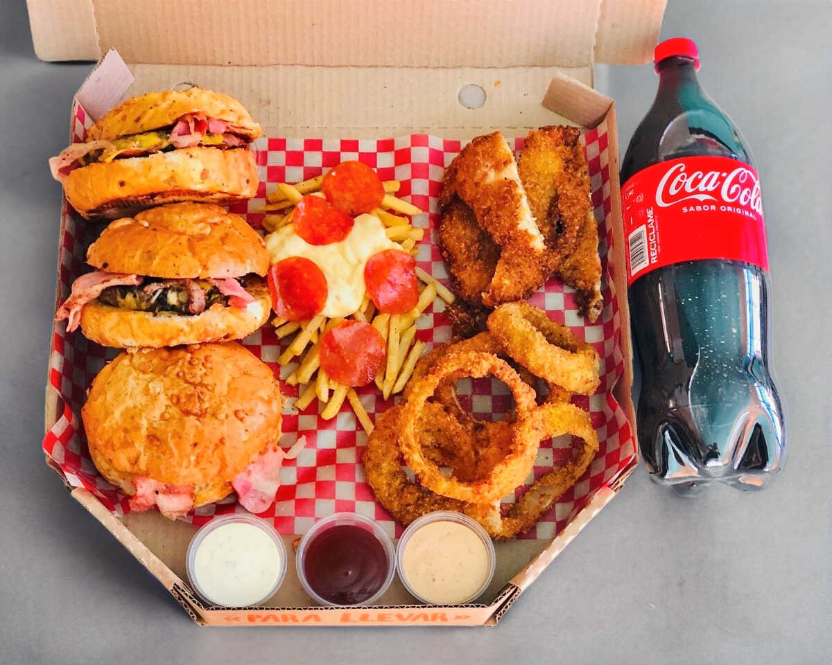 3 Hamburguesas: 150 Gramos de res, queso manchego. queso amarillo y tocino, 200 gramos de Boneless sabor a elegir, una orden de Aros de cebolla, una orden de papas gratinadas con pepperoni.