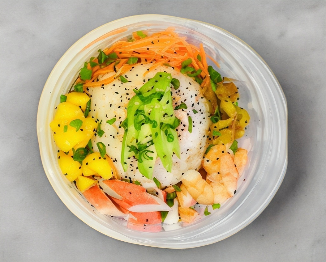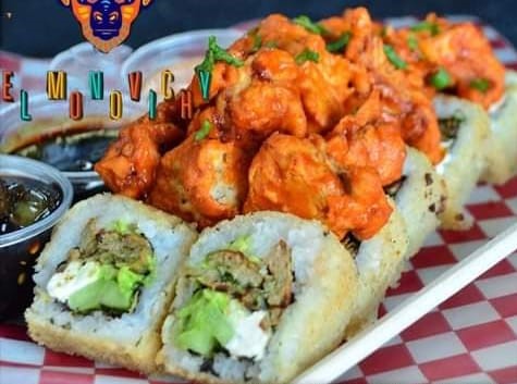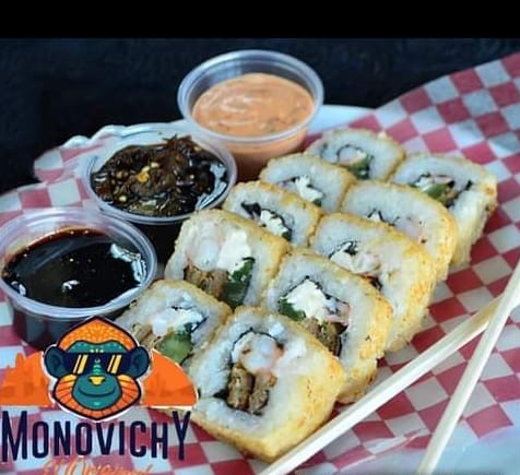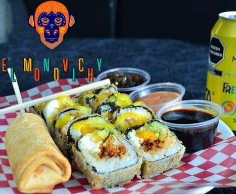 Arroz gohan, camarón, surimi, zanahoria, pepino, mango, chile caribe, tampico aguacate ajonjolí y cebollín, acompañados de chipotle, anguila y sriacha