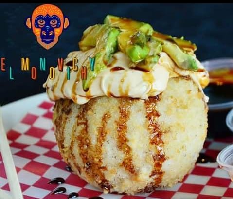 Bola de arroz rellena de camarones, sirloin, carne al pastor, queso crema, queso manchego y aguacate, bañado en una salsa de queso chipotle.