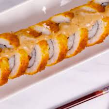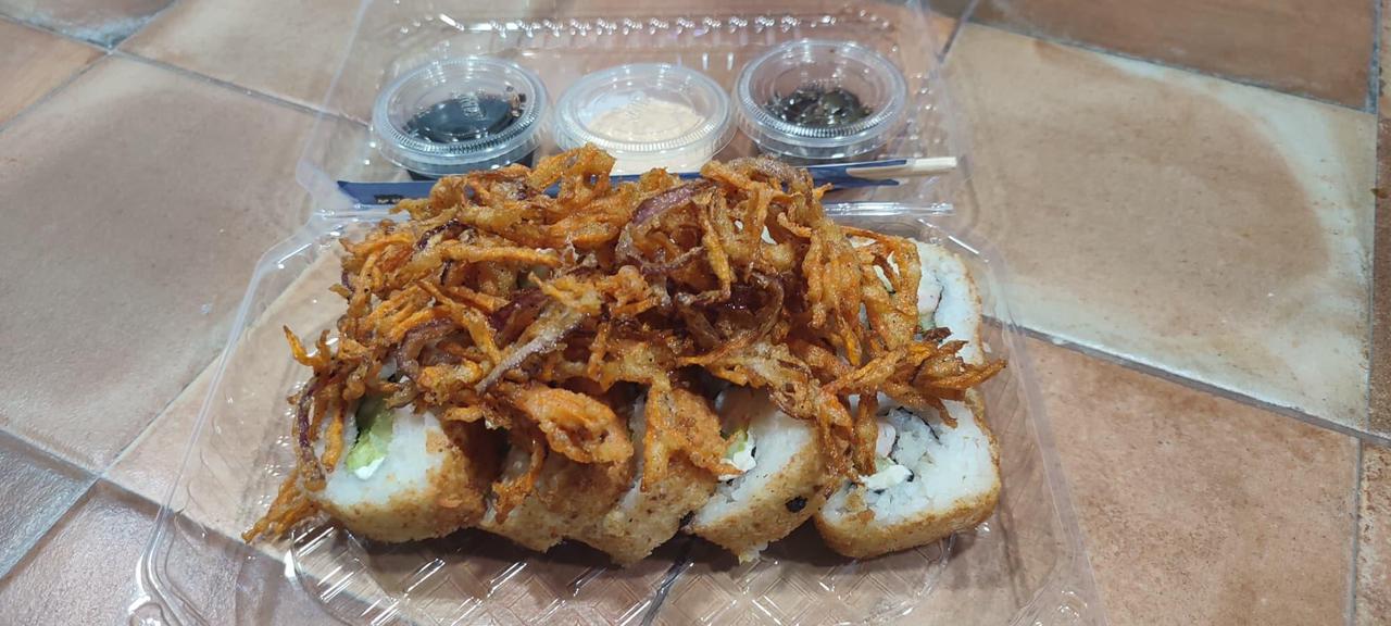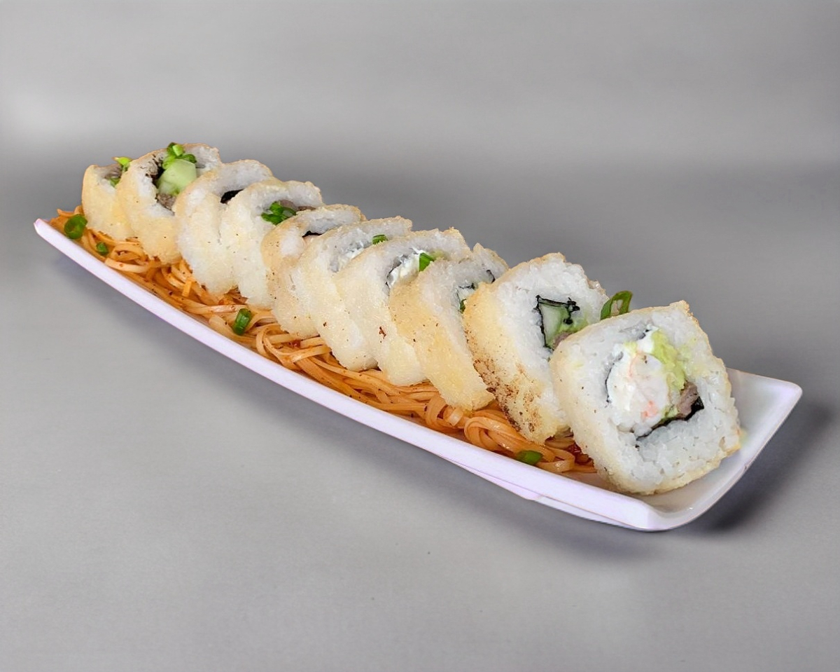 Sushi empanizado relleno de queso crema, aguacate, pepino y arrachera coronado con nuestra deliciosa salsa tampico y chile caribe toreado