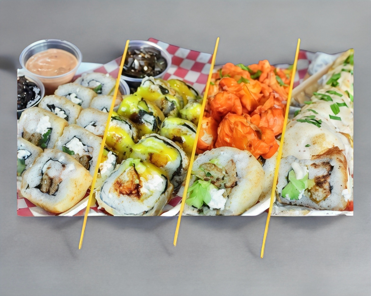 4 Rollos: mar y tierra, crujiente de mango habanero, crujiente wings y el gratinado de camarón, acompañado de un refresco de 1.5 lt.