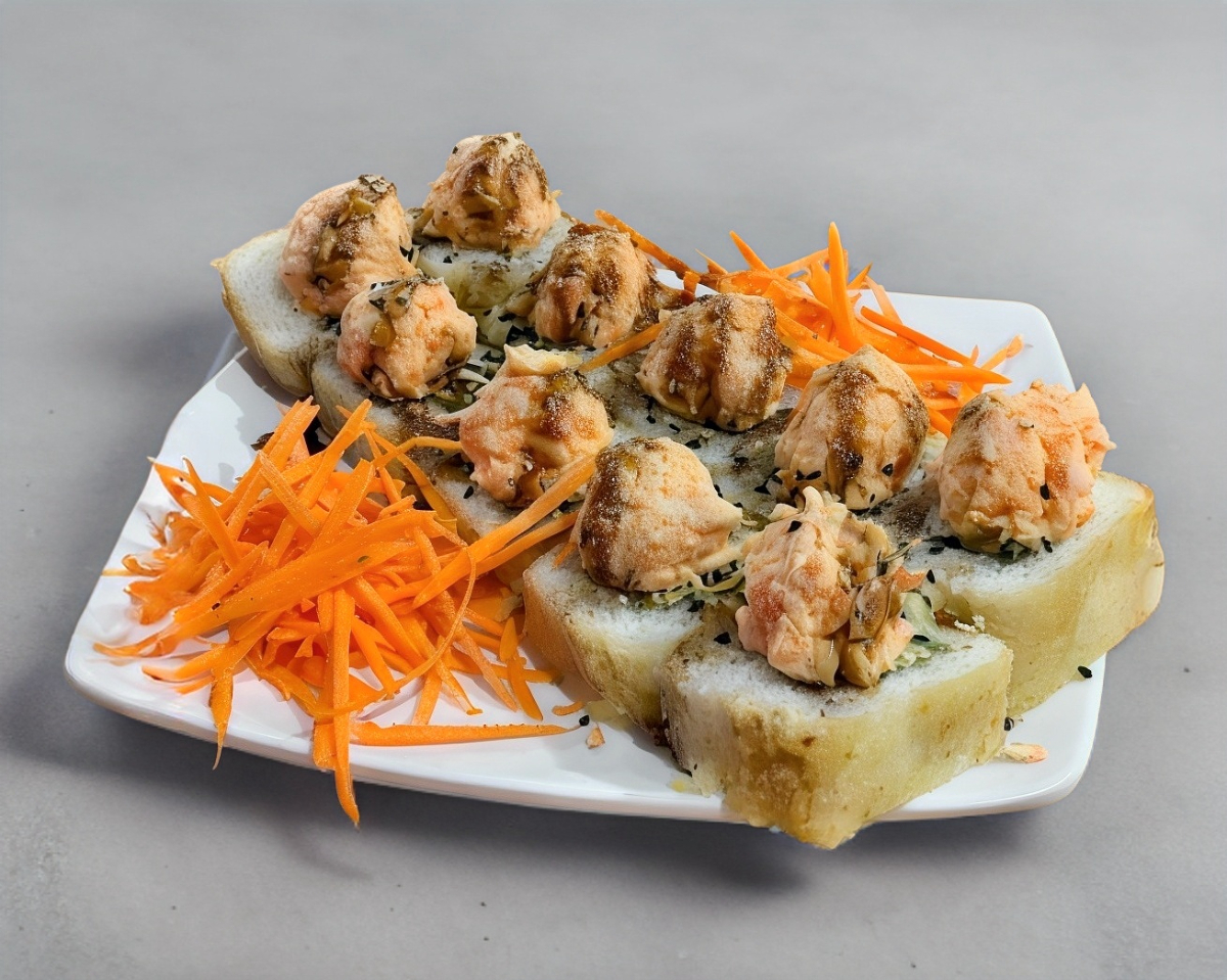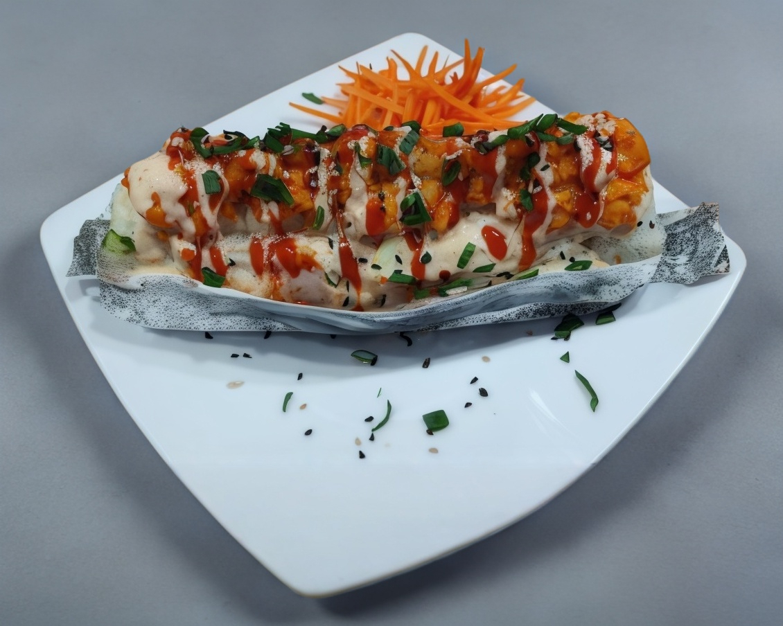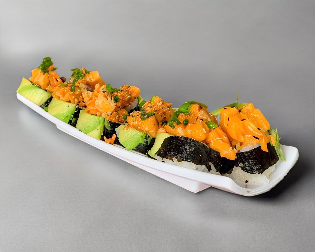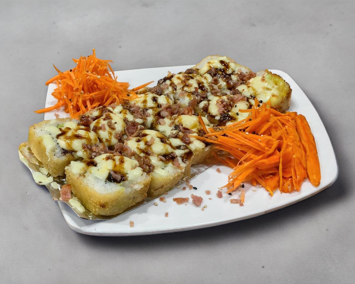 Sushi horneado de queso crema, pepino y aguacate por dentro, coronado con camarón, surimi empanizado, mayonesa picante y baño de cebollín.