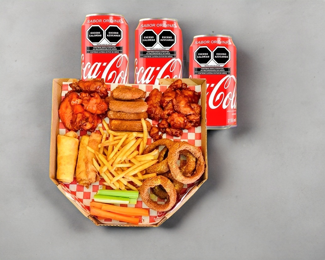 1 orden de alitas, 1 orden de dedos de queso, 1 orden de boneless, 2 rollitos primavera, 1 orden de papas, 1 orden de aros de cebolla, 3 cocas de lata